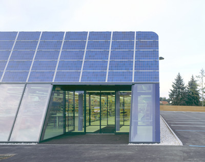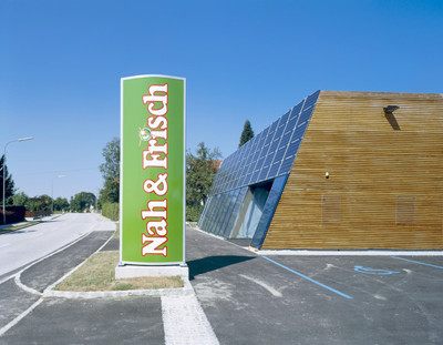 Durch seine signifikante Form zeigt dieser Markt, dass im Niedrigenergie- und Passivhaussektor die architektonische Gestaltungsfreiheit nicht eingeengt wird, sondern durchaus anspruchsvolle Projekte mit einer klaren Aussage realisierbar sind. Die Holzlattung an den Fassaden, lässt die Konstruktion des Marktes nach außen hin in Erscheinung treten. Das Grundstück wird vom Süden her über die Theningerstraße (B 133) erschlossen. Mit der Schmalseite (Hauptfassade) zur Strasse orientiert (Nord- Süd) wird das gesamte Gebäudevolumen von beiden Fahrtrichtungen aus voll erfassbar. Sämtliche Räumlichkeiten, auch das Büro und die Personalräume, sind ebenerdig situiert.