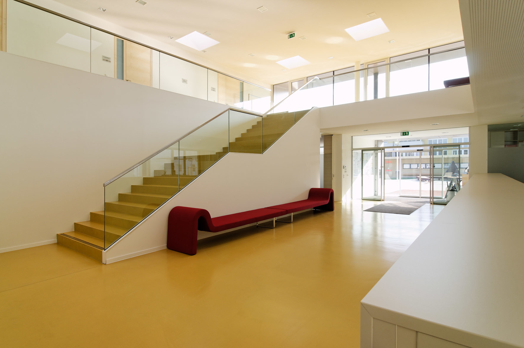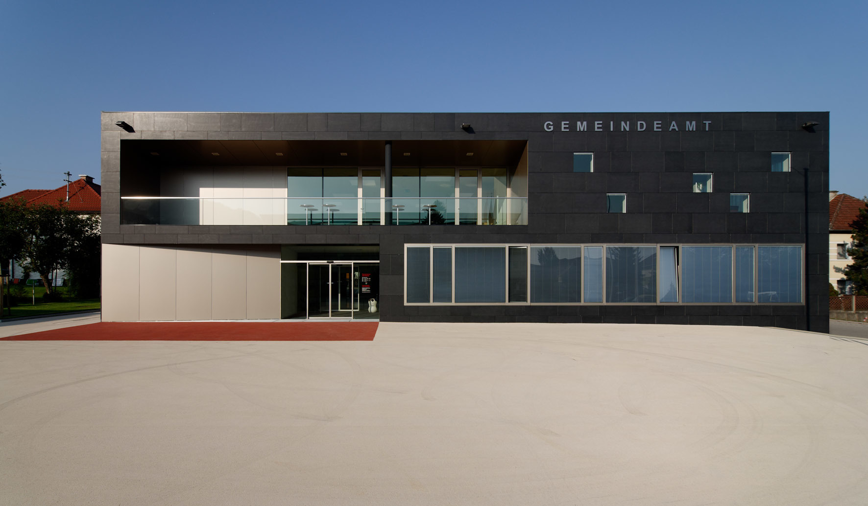 Das Gemeindeamt tritt als 2-geschoßiger Baukörper in Erscheinung, wobei das Erdgeschoß die gesamten Funktionen des Gemeindeamtes aufnimmt. Die Funktionen des Gemeindeamtes sind auf zwei Geschoßen in Raumgruppen organisiert und über eine einläufige Freitreppe verbunden. Über den oberen Foyerbereich mit vorgelagerter Loggia zum Vorplatz erreicht man den Sitzungs- und Trauungssaal im Obergeschoß,. Durch verschiedene Blickbeziehungen längs und quer, vom und in das Innere des Gebäudes wird eine konditionierte Öffentlichkeit erreicht. Ein Lift im hinteren Bereich der Halle ermöglicht eine barrierefreie Benützung des Gebäudes.