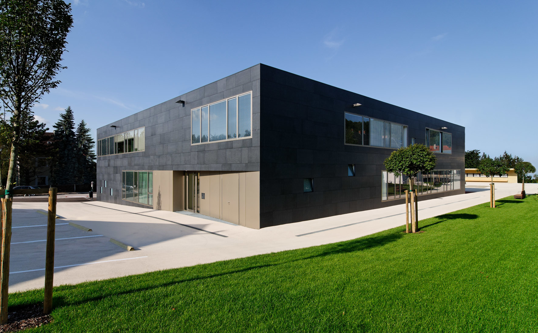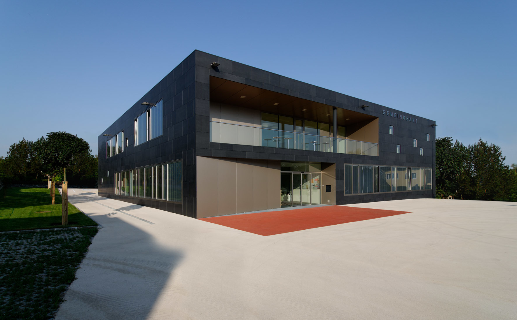 Diese Tatsachen und die Grundüberlegung, daß das Gebäude durch seine öffentliche Nutzung nicht nur mit der unmittelbaren Umgebung, sondern auch mit der gesamten Dorfstruktur in Beziehung steht führten zur Ausformung eines städtebaulichen Solitärs mit Orientierung und struktureller Anbindung an die „Obere Dorfstraße“. Das neue Gebäude tritt mit seiner antrazitfarbenen Natursteinverkleidung aus Basalt selbstbewußt in Erscheinung und bildet gemeinsam mit der bestehenden Schule und dem Kindergarten ein neues öffentliches Zentrum. Das Gemeindeamt mit Musikheim als Baukörper wirkt dabei zentrumsbildend als funktionelles Gegengewicht zum alten Ortskern mit der Kirche.