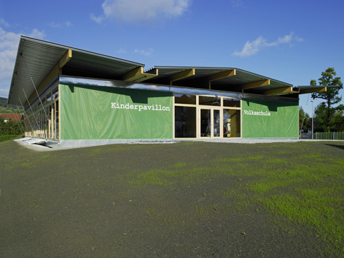 Aufgrund von Gesetzesänderungen im Bildungsbereich fehlten 2009 kurzfristig Räumlichkeiten für den Kindergarten und die Volksschule Rheindorf in Lustenau. Man zog zunächst in Betracht, einige Gruppen in Stahlcontainern zu unterrichten. Dann schlug Architekt Hugo Dworzak der Gemeinde einen temporären, modularen Holzpavillon vor, dessen von Nachhaltigkeit geprägter Entwurf die Bauherrschaft überzeugte. Gemäß der Vorstellung des temporären Bauens, aber auch um das enge Zeit- und Geldbudget einzuhalten, wurde jedes Bauelement hinterfragt. Einfache, praktikable Lösungen waren das Ziel. Effiziente Kommunikation und großes Vertrauen aller Beteiligter ermöglichten es, in knapp drei Monaten zwischen Planungsbeginn und Baufertigstellung, pünktlich zu Schulbeginn, ein auf das Wesentliche reduziertes, hochwertiges Gebäude zu errichten, das flexibel nutzbar und erweiterbar ist.Der ebenerdige „Kinderpavillon“ in unmittelbarer Nähe zu Kindergarten und Volksschule bot ursprünglich Platz für eine Kindergartengruppe, zwei Volksschulklassen, einen Bewegungsraum und zwei Sanitärbereiche und wurde 2011 um zwei Klassenräume erweitert. Die Erschließung der einzelnen Räume erfolgt über einen kommunikativen, zentralen Bereich, der multifunktional genutzt werden kann.