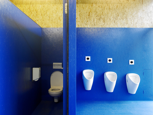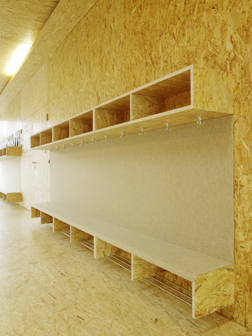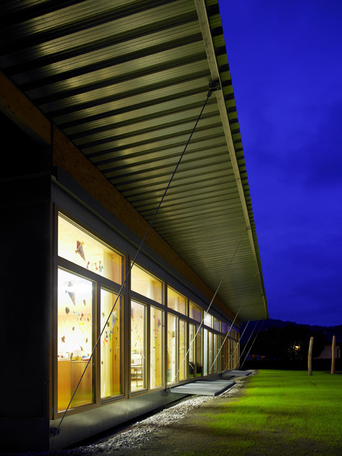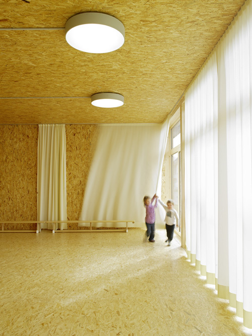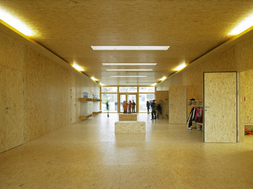 Raumhohe Verglasungen der Längsseiten erlauben einen starken Bezug zur Umgebung und schaffen lichtdurchflutete, freundliche Zimmer. Die Wirkung der hellen Räume wird durch die einheitliche Verwendung von OSB Platten als sichtbares Boden-, Wand- und Deckenmaterial verstärkt. Dadurch wirken Gruppen- und Klassenräume weit und großzügig. Fenstertüren lassen sich großflächig öffnen und erweitern bei Bedarf den Raum nach außen.