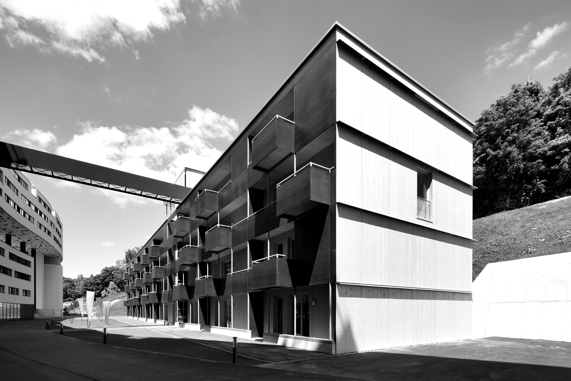 Der Zugang zu den Wohnateliers erfolgt zentral über einen „Erschließungsturm“. Dieser hebt sich sowohl in seiner Höhe als auch in seiner Materialität vom restlichen Gebäude ab. Über das zentrale Stiegenhaus erreicht man auch die Fußgängerbrücke, welche das Freigeschoss des Hauptgebäudes mit dem angrenzenden Park im Norden verbindet. Somit existiert ein direkter, barrierefreier Zugang in den Park, welcher nicht nur den Bewohnern, sondern auch Passanten offen steht. (Text Architekten, redaktionell überarbeitet Martina Frühwirth)