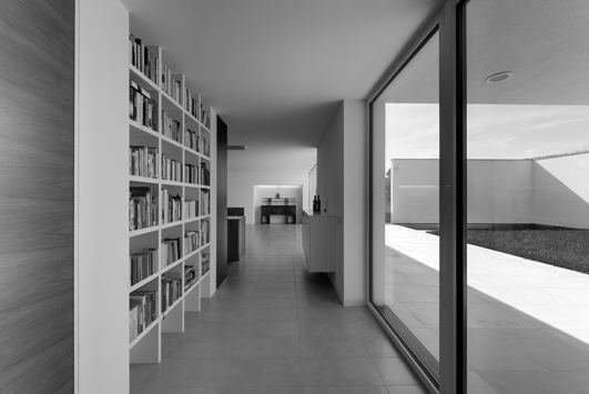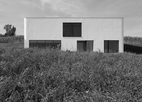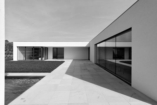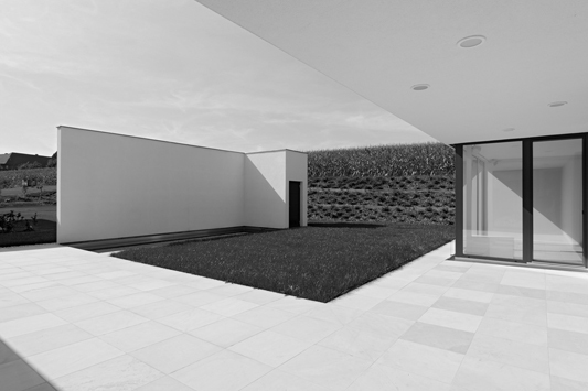 An der Straßenseite zeigt sich das Haus zweigeschossig, Garage, Büro und Eingang sind zu ihr orientiert. Der Treppenaufgang endet in einer Hofecke, am Beginn zweier Gänge, welche einerseits zu den straßenseitigen Wohnräumen und andererseits zu den Schlafräumen führen. Eine gedeckte Terrasse ist wie ein Stück eines Kreuzganges in dieser Innenecke vorgelagert. Sie geht am Ende des Elternschlafzimmers in das nur durch eine Glasscheibe getrennte Bad über. Diesem winkelförmigen Grundriss des beheizten Gebäudeteiles ist eine winkelförmige Hofaußenwand gegenübergestellt, in der ein Schuppen integriert ist. In die von ihr definierte Rechteckfläche ist ein Schwimmbecken eingelassen. Der Kontrast zwischen den spähenden Ausblicken in die Landschaft und den Sichtbeziehungen über und in den Hof prägt die Aura des von Putz- und Steinoberflächen dominierten Hauses.
