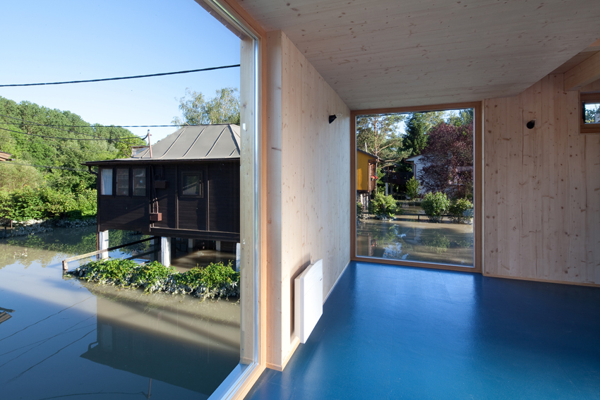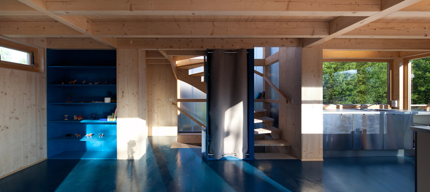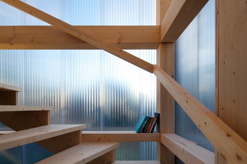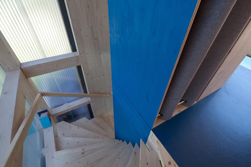 Die Wohnebene auf +3,0 m ist gemeinsam mit der Terrasse um die Küche herum organisiert. Werden die Klappfenster geöffnet dann entwickelt sich der Küchenblock zum freistehenden Tresen, der von beiden Seiten benützt werden kann. Die Schlafebene liegt auf +5,45 m und die lichte Raumhöhe beträgt dort nur 2 m, die Kubatur ist daher möglichst sparsam aufgeteilt in zwei kleine Schlafkojen. In der gemeinsamen Ankleide sind Schränke und Stauraum zusammengefasst. Das Bad ist auf Bodenniveau in einer Wanne aus Dichtbeton untergebracht, der Zugang und auch die Belichtung erfolgt ausschließlich über Öffnungen in der Decke. Die unterschiedlichen Ebenen werden über steil gewendelte Holzstiegenläufe verbunden, die zur Außenluft hin mit halbtransparenten Kunststoff-Stegplatten verkleidet sind und damit den Stiegenraum als eigenes Raumvolumen beschreiben.