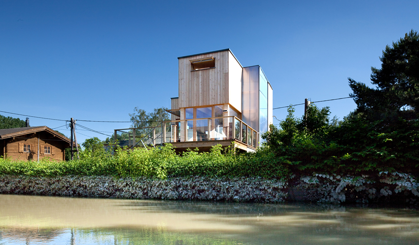 Das Haus ist aus teilweise vorgefertigten Holzriegelelementen errichtet. An der Innenseite ist die konstruktive Beplankung unverkleidet belassen. Bei den Holztramdecken sind die Träme teilweise bereits im Gefälle verlegt, um für Dach und Terrasse zusätzliche Gefällekeile zu vermeiden – die Gesamthöhe der Obergeschosse war mit 4,70 m streng limitiert! Dadurch ergibt sich für das Obergeschoss eine Raumhöhe von nur 2,05 m bis 2,00 m. Die hinterlüftete Außenfassade ist mit vertikal angeordneten gehobelten Lärchebrettern verkleidet. Die Betonwände im Bad blieben roh und ohne Behandlung. Die Duschnische und Vorsatzschalen bei den Waschbecken sind mit dunklen finnischen Schalungsplatten verkleidet