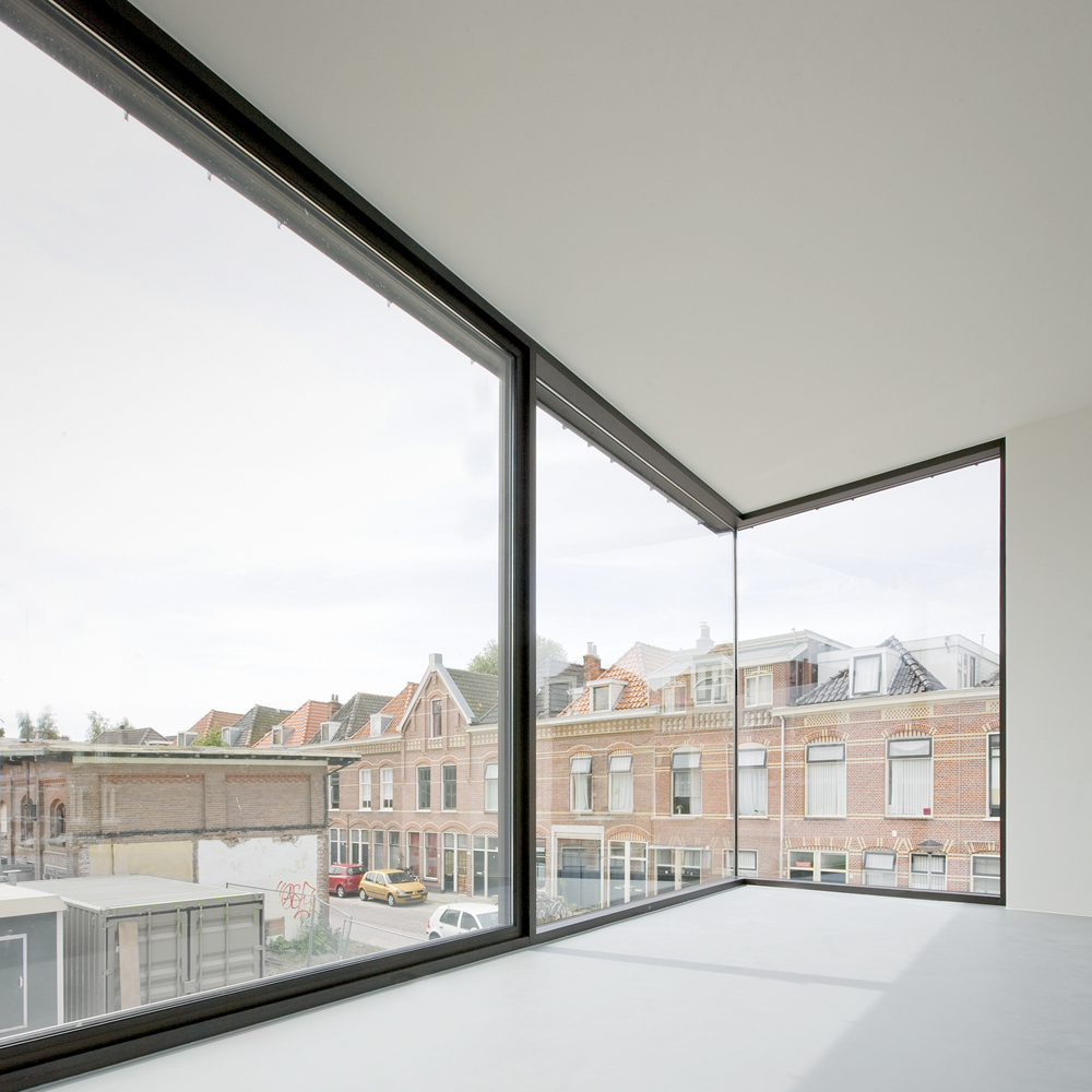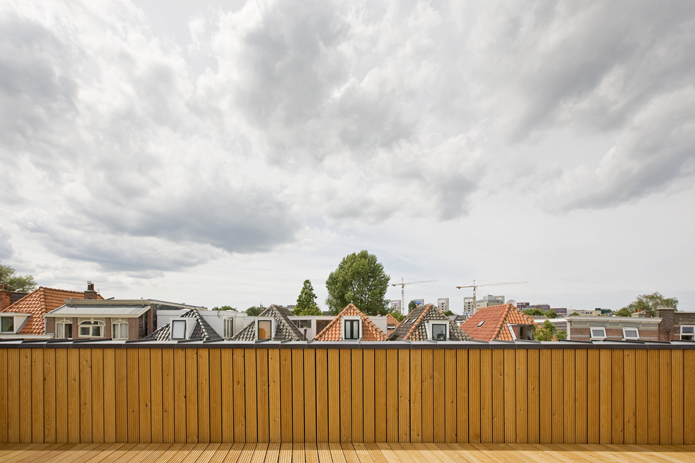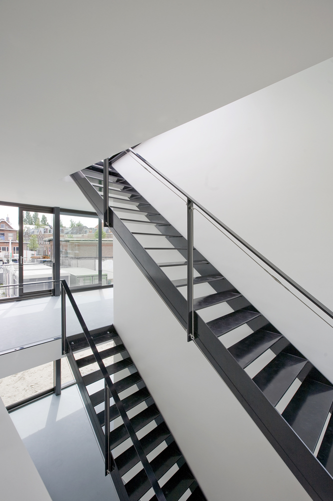 V21K01 besteht aus zwei sehr unterschiedlichen Geschossen, die den internen Tagesablauf der Bauherren ablesbar machen und von einer großzügigen Dachterrasse bekrönt werden. Das geschlossene Erdgeschoss beinhaltet eine sehr spezifische Raumfolge von Privatzonen und betont die Zurückgezogenheit dieser Funktionen. Dem gegenüber ist die Bel-Etage ein offener, freier Grundriss mit raumhoch verglaster Fassade. Hierbei dienen die gegenüberliegenden historischen Fassaden quasi als Raumabschluss und betten den wunderbar spektakulären Raum unvermittelt in seinen städtischen Kontext ein. Den krönenden Abschluss bildet die royale Dachterrasse. Über den Dächern der Stadt kann man den atemberaubenden Blick auf die historischen Türme und Windmühlen Leidens genießen.