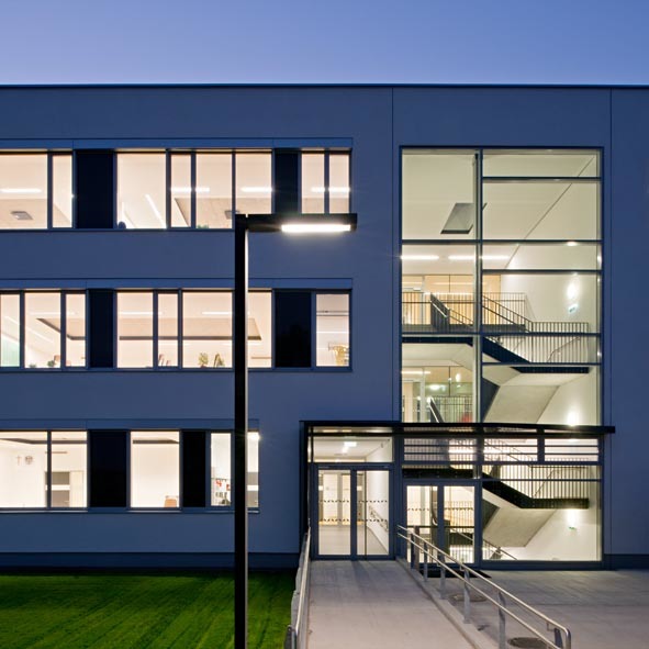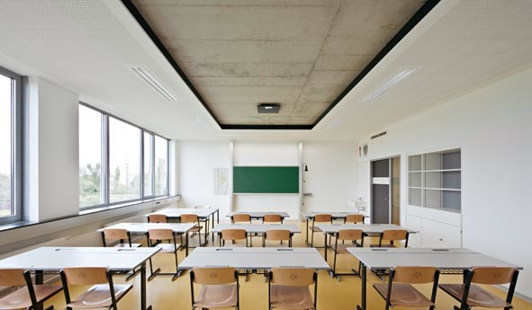 Im Schulbau herrschen – ungewöhnlich – klare Verhältnisse. Denn das Programm, das ein Architekt zu erfüllen hat, ist in der Regel recht genau definiert. So kann sich der Planer ganz auf das konzentrieren, was aus einer geforderten Anzahl von Räumen mehr macht als die bloß additive Aneinanderreihung, man denkt über Synergien nach, über abwechslungsreiche Raumfolgen, über die qualitative Überformung der geforderten Funktion.