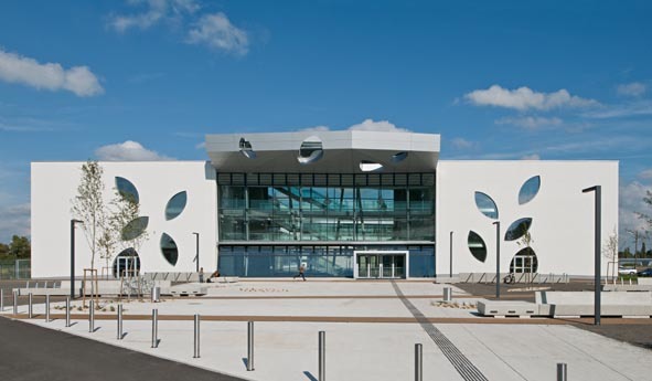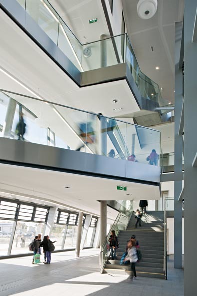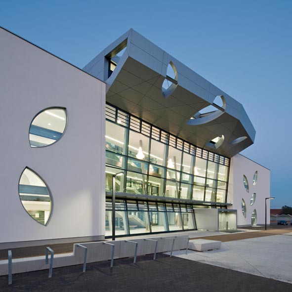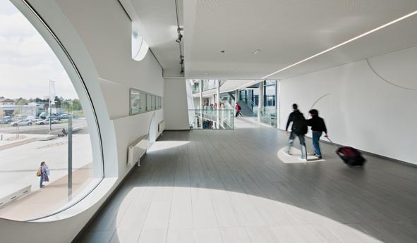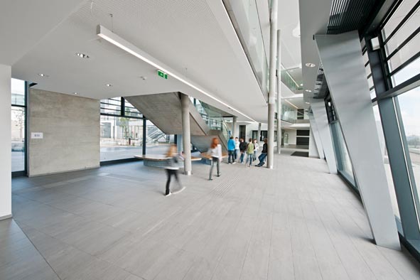 Städtebaulich war die Situation eindeutig. Der Haupteingang ist an der Ecke zur Aspernstraße situiert, allerdings wurde das Gebäude sehr weit zurückgesetzt, sodass ein großer öffentlicher Vorplatz entstand. Das war schon aus Sicherheitsgründen (Verkehr) wichtig. Es steigert aber auch die Wirkung der markanten Front mit ihrer gläsernen Mitte, die durch eine Art „Vordachplastik“ bekrönt ist, und den beiden Seitentrakten, in die linsenförmige Öffnungen geschnitten sind. Diese Linsenformen sind das dekorative Leitmotiv, auf das man im ganzen Haus trifft: Oft sind sie verglast und setzen in den langen Erschließungsgängen einen wichtigen Akzent, weil sie Licht hereinholen und Ausblicke ermöglichen; oft sind sie aber auch reine „Dekoration“, gezielt platzierte Elemente, die zeigen, was unter der weißen Oberfläche der ziemlich massiven konstruktiven Wände (60 Zentimeter) ist – Ortbeton. Und in einem Fall, im Festsaal, sind diese Linsen „blind“, also weiß wie die Wand. Übrigens zeigen die Architekten den rohen Beton auch in den Klassen und etwa im Festsaal jeweils als viereckige Ausnehmung an der Decke.