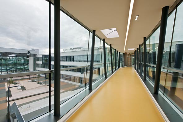 Alle Stammklassen sind nach außen orientiert, alle Sonderräume zum Hof. In den fast überbreiten Gängen finden sich immer wieder Sitznischen, auf dem Boden liegt ein gelber Kunststoffbelag, die Grundstimmung ist – auch durch das Spielerische der Linsenelemente und der Fensterlinsen an den Gangenden – ausgesprochen freundlich.