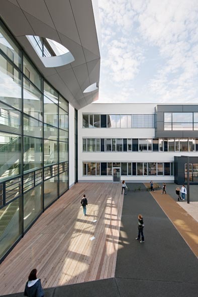 Der Komplex ist um einen großen Innenhof komponiert und nach hinten, zu den Sportanlagen durchlässig. Da ist einer der drei Turnsäle eingegraben, das Gelände steigt an, was die Architekten sehr geschickt für Sitzstufen genutzt haben, die zu einer Bühne orientiert sind. Eine verglaste Brückenverbindung im zweiten Obergeschoß schließt das Viereck des Hofes optisch ab, die Verbindung auf der Ebene des ersten Obergeschoßes blieb offen, da ist man nur regengeschützt. Atmosphärisch profitiert der Schulhof von dieser Durchlässigkeit, er weist gewissermaßen über sich hinaus, wird auch zum Weg.