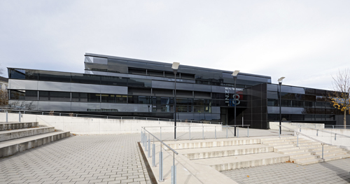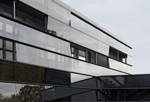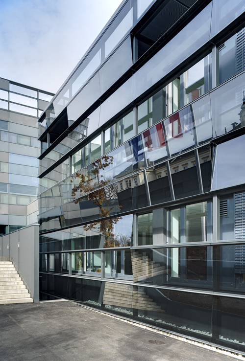 Einzeln in den Klassen situierte Lüftungsgeräte mit Wärmerückgewinnung versorgen die Räume mit Frischluft, sie sind vor Ort präsent und dienen damit den Schülern auch als fachspezifische Schauobjekte. Zusätzliche atmosphärische Verbesserung bewirken lärmdämpfende Akustikelemente für Decken- und Wandflächen. Das neue Dach über dem zentralen Treppenhaus ist als gelochte Platte ausgeführt und trägt zum Überhitzungsschutz des Hauses bei.