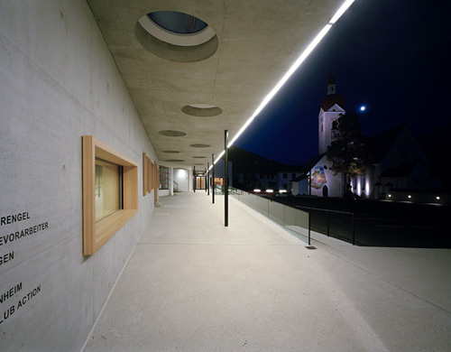 Das wesentlichste Element der Neugestaltung ist ein in Sichtbeton realisiertes, erhöhtes Podest mit Rückwand und Dach, das die Eingangsbereiche von Gemeinde, Kindergarten, Volksschule und Vereinsgebäude zusammenfasst. Über die gesamte Länge geführt verbindet es Alt und Neu zu einer Einheit und schafft gleichzeitig vor den Gebäuden einen gedeckten und geschützten Außenraum für vielerlei Aktivitäten.