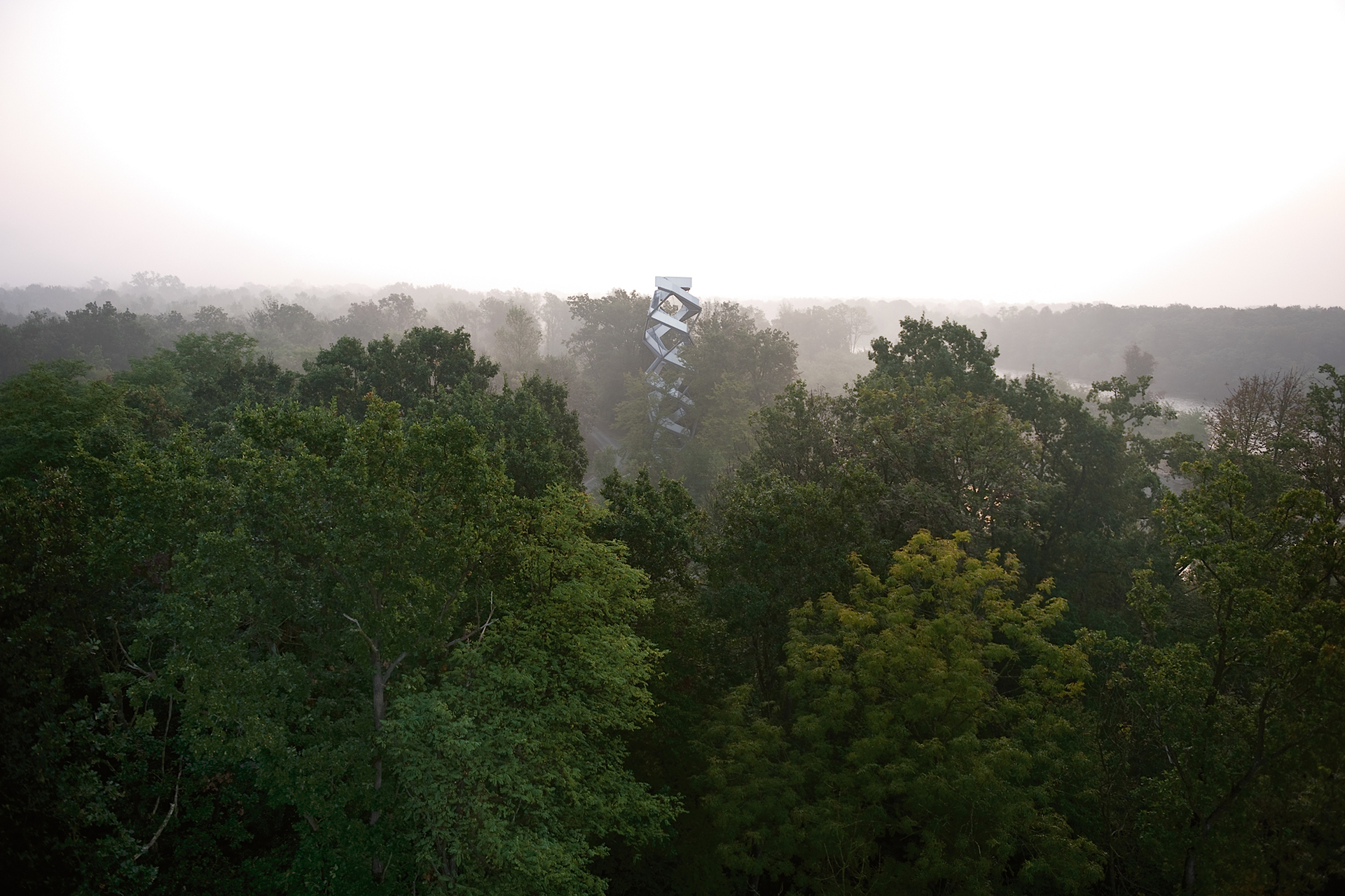 Ein bewusster Fremdkörper aus Stahl und Aluminium rankt sich aus dem Auwald in der Südsteiermark in die Höhe, ein geometrisch anmutender Aussichtsturm, der sich doch so schlüssig in das Landschaftsbild einfügt wie ein harmonischer Kontrapunkt. In diesem Bereich der Südsteiermark nahe Bad Radkersburg verläuft die Grenze zu Slowenien, die Mur ist der Grenzfluss. Entlang der Grenzen zum ehemaligen Eisernen Vorhang verläuft auch der „European Green Belt“, das Grüne Band Europas, ein einzigartiges Naturgebiet, das aus der Situation der rigiden Abgrenzung entstanden ist. Heute ist es ein entspannter Ausblick an das andere Ufer, das Ziel, das man gemeinsam verfolgt ist die Renaturierung des Flusslaufes und der Aulandschaft. Vom Naturschutzbund unterstützt sollte der Turm zuerst lediglich als bauliches Zeichen für den „European Green Belt“ dienen, geworden ist daraus eine architektonische Skulptur und eine Blickmaschine auf die Landschaft.