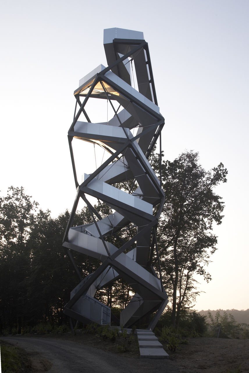 168 Stufen lang geht man seinen eigenen Weg und doch ist man ineinander verschlungen, sieht die Landschaft in verschiedensten Etagen, blickt immer wieder unverhofft dem gegenläufigen Gegenüber ins Auge: zwei Treppenläufe schrauben sich ineinander verdreht in Richtung Himmel empor. Am höchsten Punkt dieses signifikanten visuellen Ankers, auf 27 Meter Höhe, entdeckt man schließlich, dass es sich um einen kontinuierlichen Weg handelt. In der Doppelung des Auf und Ab, mit einer räumlichen Verschraubung wird so das Gegenüber erzeugt.
