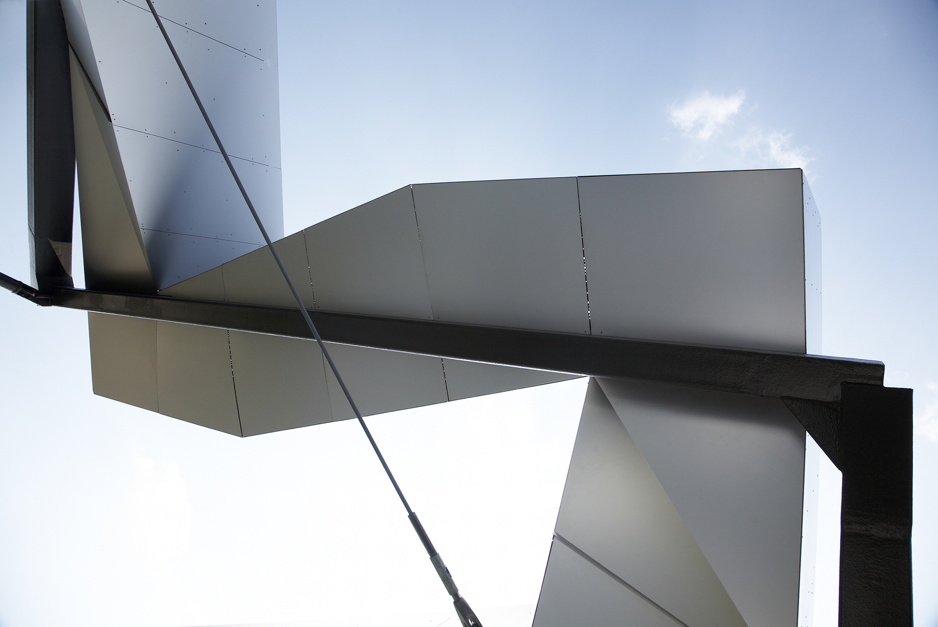 Umso größer die Überraschung, als die auf den ersten Blick überraschend massiv wirkende und mehrfach verspannte Konstruktion sanft schwingt unter den Schritten. Betrachtet man die Konstruktion vom Boden aus, so stechen die elegant gelösten Knotenpunkte ins Auge. Die Form, die entsteht, durch die Art wie die Stahlträger aufeinander treffen und miteinander verbunden sind, ist mit Gestaltungslust durchdetaillierte Geometrie in der die Räumlichkeit des Turms zum Ausdruck findet.