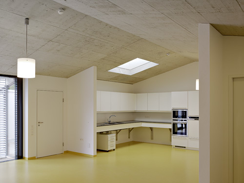 Im Erdgeschoss des Neubaus sind Therapieräume untergebracht, in den Obergeschossen jeweils Wohngruppen. Die gemeinsamen Wohnbereiche sind nach Süden orientiert und öffnen sich über vorgelagerte Balkone zum privaten Garten- und Grünbereich, die Einbettzimmer liegen an der Nord- und Westseite. Die großflächige Fensteröffnungen erhielten als Sonnen- und Sichtschutz stehende Fensterläden, die gleichzeitig die Fassaden der Nord- und Westseite rhythmisieren.