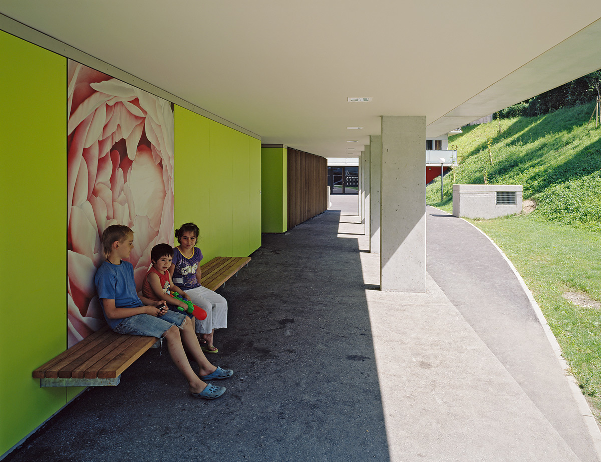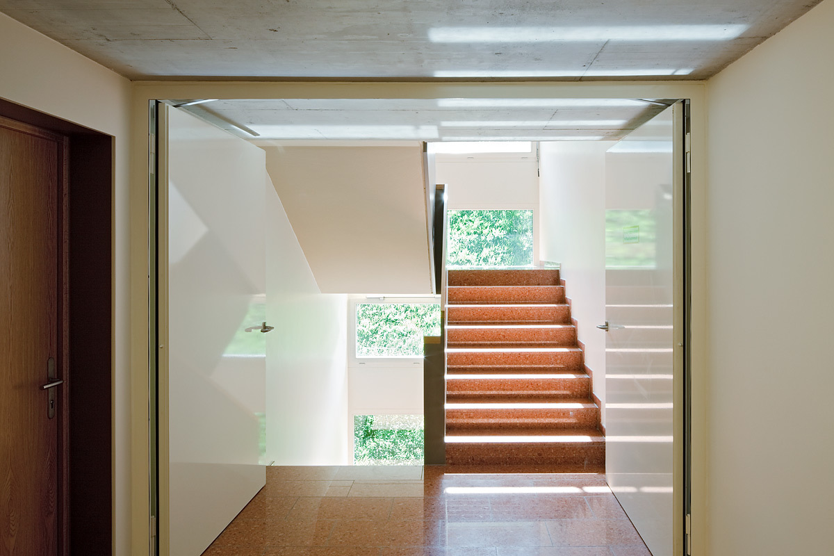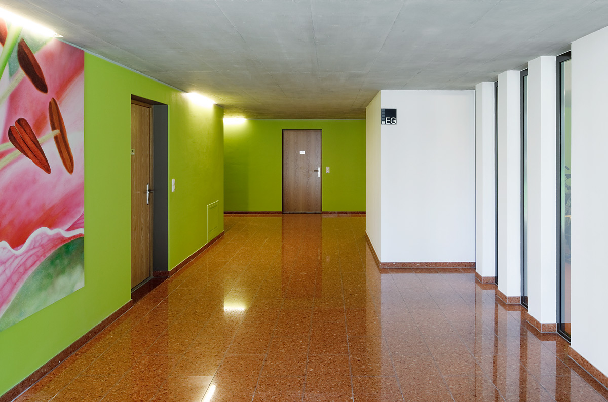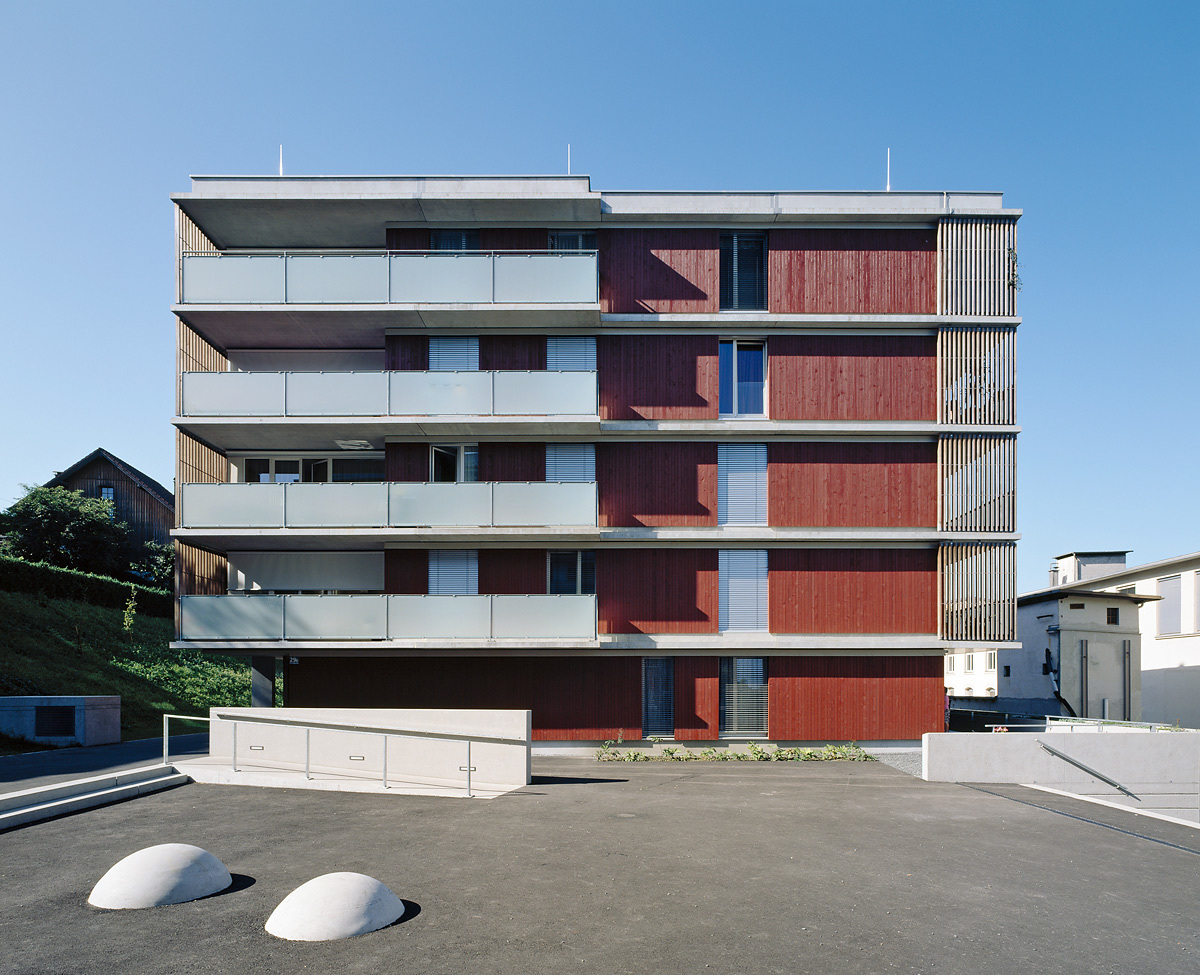 Maximal vier Wohnungen sind pro Geschoß erschlossen. Hell, klar organisiert zeigen sich die Raumabfolgen in den zwei- bis vier Zimmerwohnungen. Der Hauptraum mit offener Küche wird mit der breiten doppelflügeligen Balkontüre hervorgehoben. Auch die weiteren Zimmer wirken durch große Fenster, die bis zum Boden reichen, geräumig und geben südländisches Flair. Die Bewohner genießen Tageslicht von zwei Himmels- und vom Balkon aus die Aussicht in drei Blickrichtungen, ab dem dritten Stock bis zum Bodensee. Kleinteiligkeit entsteht auch durch den deutlichen Geschoßvorsprung außen, der als Wetterschutz dient und die rot lasierte Holzfassade realisierbar macht. Die Privatsphäre bezüglich Uneinsichtigkeit der tief und breit angelegten Balkone ist gegeben, denn der Nachbar sitzt am nächsten Eck.