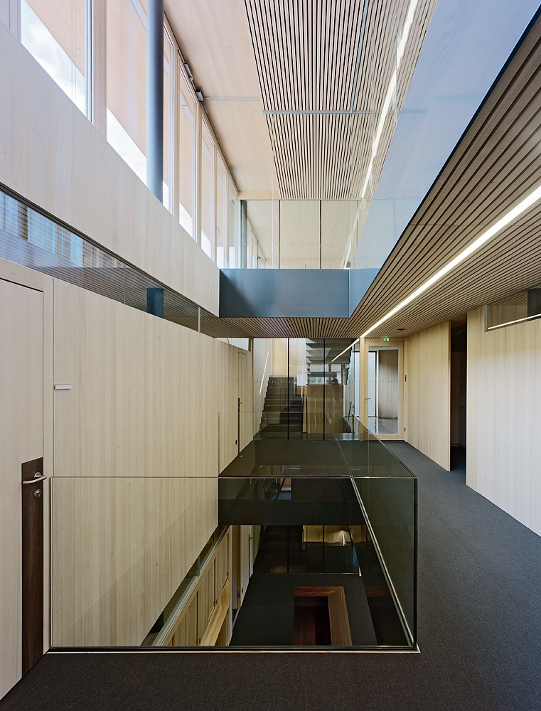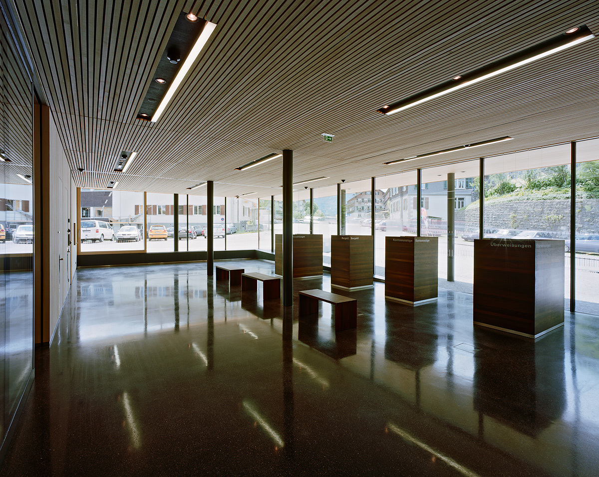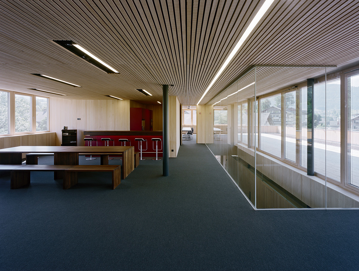 Energie: Ein energetisch hochwertiges Gebäude mit Vorbildcharakter sollte errichtet werden. Durch die Verwendung einer Photovoltaik-Anlage sowie den Anschluss an das Nahwärmenetz wird ein primärenergetisch ausgeglichener Energiebedarf erzielt, sodass das Gebäude über das Jahr gesehen emissionsfrei ist. Ein insgesamt ausgeklügeltes Energiekonzept reduziert den Energieaufwand auf ein Minimum, Passivhaus-Standard wird nahezu erreicht. Die Wertschöpfung bleibt in der Region Bregenzerwald. 85% der Ausführungsarbeiten wurden an Bregenzerwälder Handwerker bzw. hauseigene Kunden vergeben. (Text: Martina Pfeifer Steiner)