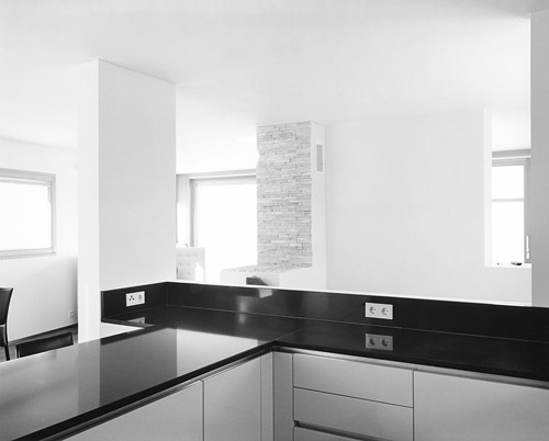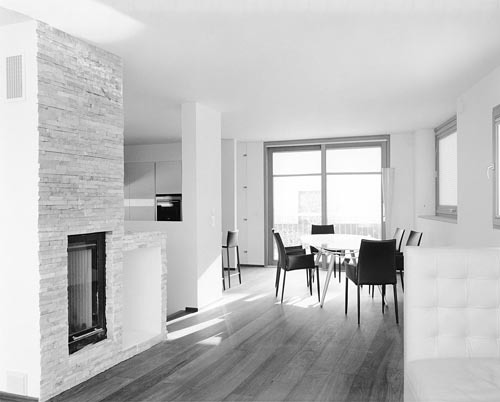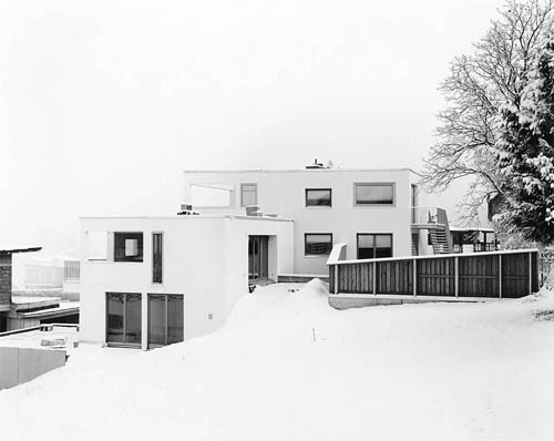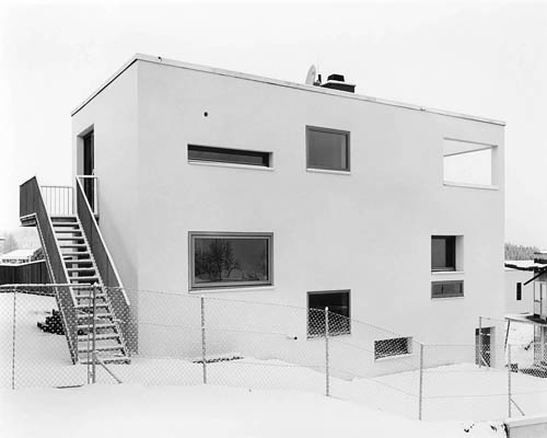 In großer Dichte wurden auf der (einstweilen noch) grünen Wiese zwei exakt abgestimmte Baukörper entwickelt, gestaffelt nach Höhe und Himmelsrichtung. Von einem atriumartigen Hof auf Straßenniveau werden die Wohnungen gemeinsam über eine Freitreppe erschlossen, ein Patio im Geschoss darüber bildet einen weiteren, gemeinsam nutzbaren Bereich in einer logischen Abfolge von öffentlich, halböffentlich und privat. Die Wohnbereiche sind entsprechend des unverbaubaren Panoramablicks jeweils im obersten Geschoss angeordnet, Freiflächen sind den Wohnungen als Dachterrassen bzw. im Gelände zugeordnet. Die Autos verschwinden unter eingeschütteten und begrünten Dächern. (Text: Claudia Wedekind nach einem Text der Architekt:innen)