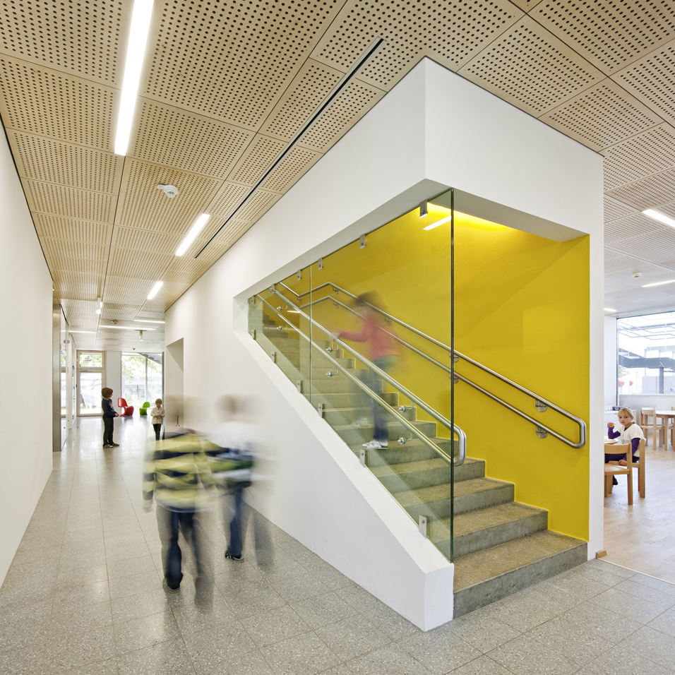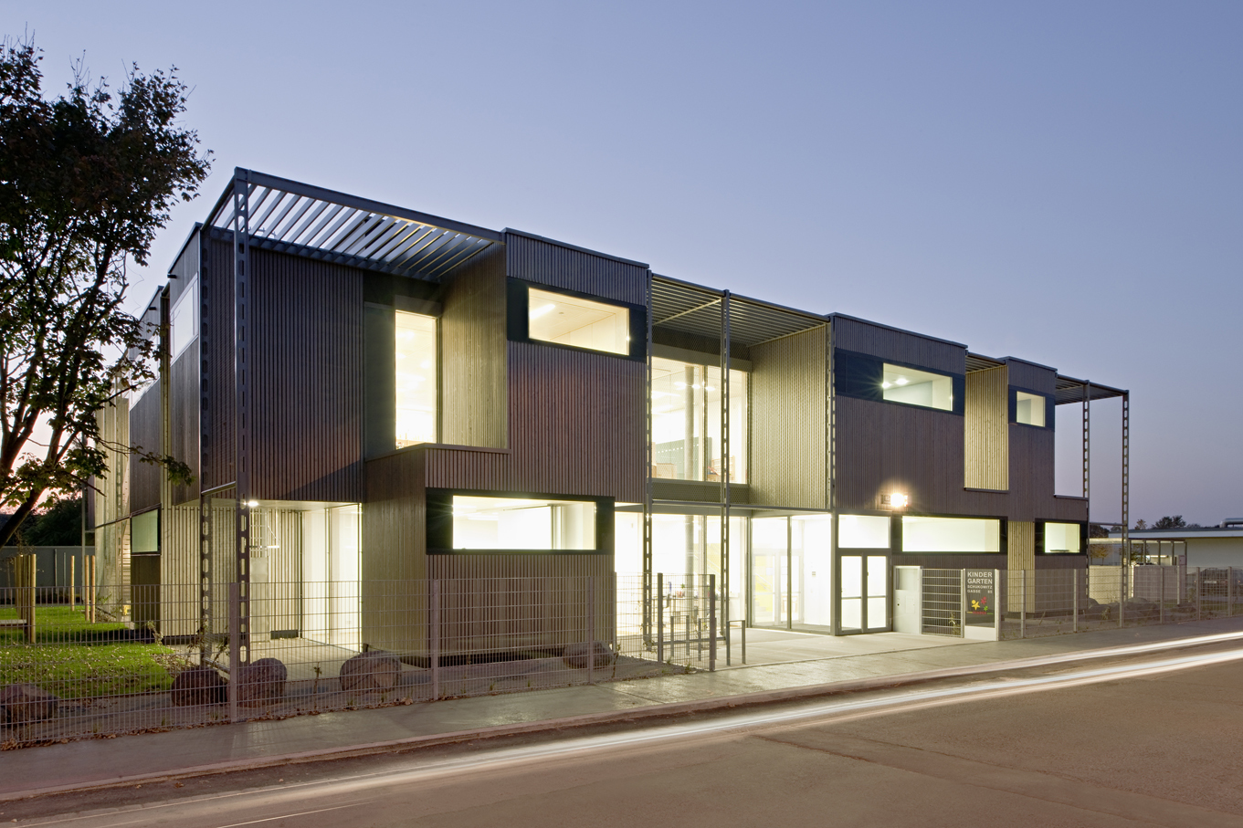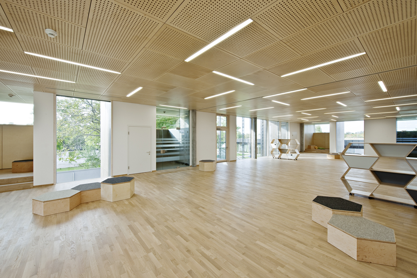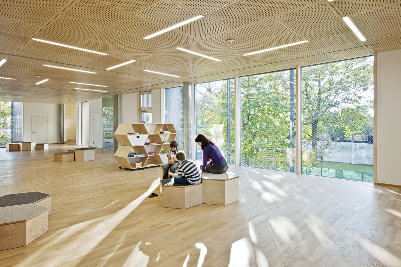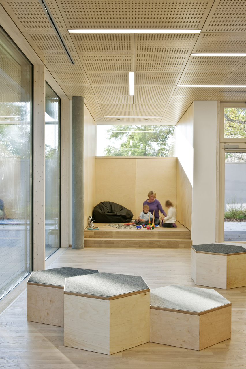 Der rechteckige Nutzungskern des Kindergartens ist als räumlich offenes System konzipiert, Glaswände ermöglichen Durchblicke und erleichtern die Orientierung im Gebäude. Die Spielflächen und Kreativbereiche können flexibel definiert werden, sodass mit veränderbaren Möblierungselementen ein großzügiges räumliches Kontinuum mit unterschiedlichen Kombinationsmöglichkeiten entsteht.Im Erdgeschoss befinden sich neben der Administration und Therapie das Bistro sowie zwei Gruppenräume für Kleinkinder. Im Obergeschoss liegen vier weitere Gruppenräume, wobei hier einer davon als Ruheraum dient. Jeder Gruppenraum verfügt auch über eine Spielkoje, die den Kindern als intimer Rückzugsbereich zum Spielen und Entspannen dient.