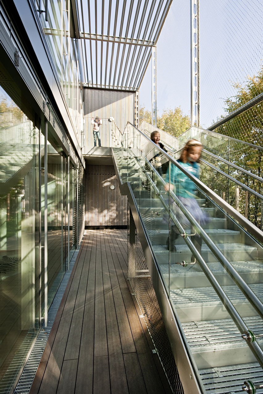 Um den Gebäudekern herum befindet sich eine „Filterschicht“ mit Nebenräumen, Außenstiegen, einer „Verandazone“ mit pflanzlichem Sonnenschutz und Spielbereichen. Die „dienenden“ Räume (WCs, Abstellräume) sind als Annexe zu den einzelnen Haupträumen an der Fassade angeordnet. Die abwechselnd offen und geschlossen gestaltete Fassade erlaubt vielfältige Ein- und Ausblicke und stellt Bezüge zwischen dem Innen- und dem Außenraum her.