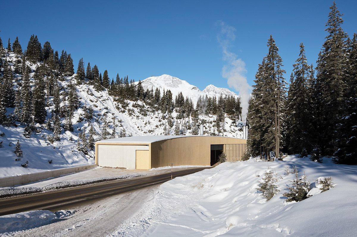 An einem außergewöhnlichen Ort, in der letzten Kurve auf der Straße von Zürs nach Lech, wurde 1999 das erste Biomasseheizwerk der Gemeinde Lech errichtet. Die Kapazität der beiden Heizkessel war nach über zehn Jahren durch die Expansion des Fernwärmenetzes erschöpft. Das bestehende Bauwerk erfuhr nun eine Erweiterung um ein neues Heizhaus und eine Lagerhalle für Biomasse.Die Gebäudeform entstand aus der besonderen topographischen Situation. Auf dem Grundstück an der engsten Stelle des Tales, zwischen Lechtalstraße und Zürsbach, nimmt bereits das bestehende Gebäude den Schwung der Straße auf. Der Erweiterungsbau führt die Form weiter und bildet zusammen mit dem ersten Baukörper ein stimmiges Ganzes.