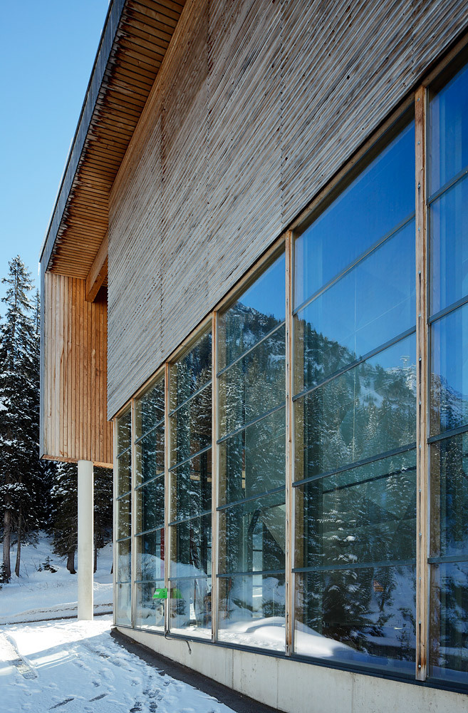 Als Zweckbau vor den Toren von Lech erlebt man das Gebäude meist im Vorbeifahren. Das Biomasseheizwerk schafft es in der „kräftigen Umgebung“ inmitten von Berghängen und -gipfeln eine klare Position einzunehmen. Gleichzeitig lässt die aus der geschwungenen Form des Gebäudes und dem gewölbten Dach entstehende Dynamik das große Volumen der Baumasse in den Hintergrund treten. (Text: Julia Ess)