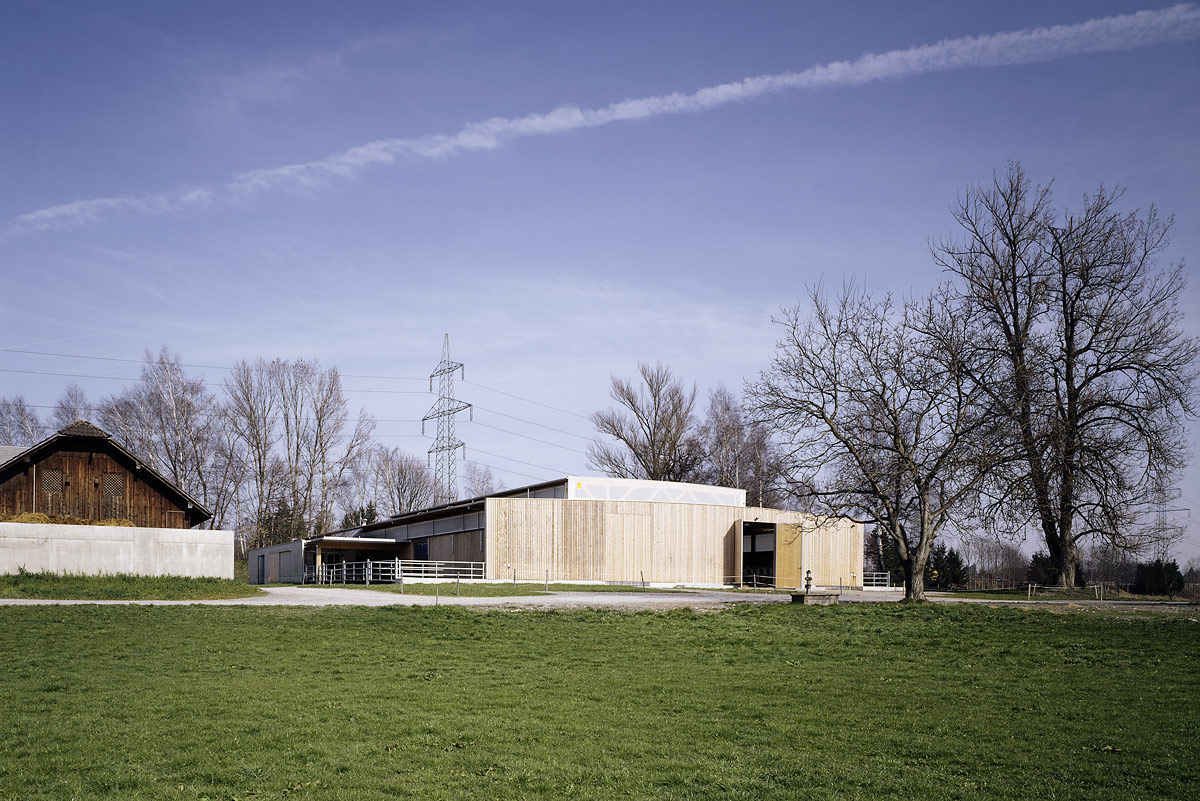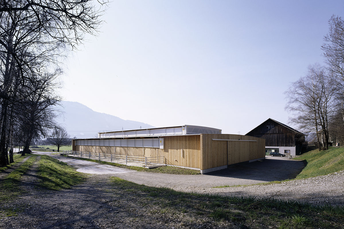 Im Oktober 2005 wurde das Stallgebäude Rheinhof der Landwirtschaftsschule Hohenems durch einen Brand komplett zerstört. Das Land Vorarlberg entschied sich als Eigentümer für einen Neubau und somit für die Weiterführung des Ausbildungshofes als wichtige Lehrstätte für die praktische Anwendung theoretischen Wissens.Bei der Planung eines Stallgebäudes sind die Verantwortlichen mit vielen funktionalistischen Einschränkungen und einzuhaltenden Richtlinien konfrontiert. Aus pragmatischen Gründen entstehen daher oft Fertigteilbauten, die an große Festzelte mit Satteldächern erinnern. Aus diesem Schema ausbrechend gelang auf dem Rheinhof Hohenems in Zusammenarbeit von Architekt, Schule, Bauern und Agrarbezirksbehörde eine beispielhafte Umsetzung der Bauaufgabe Stall.