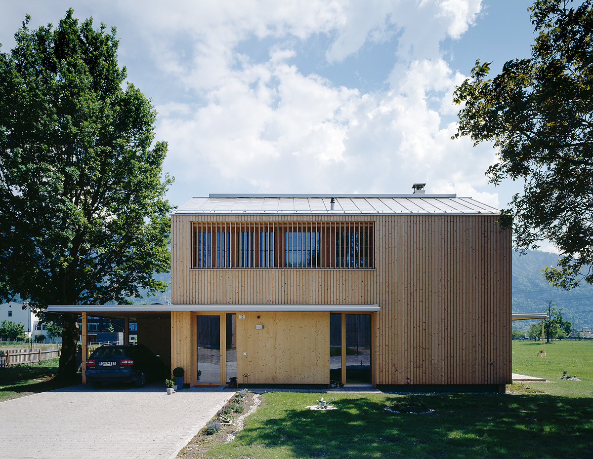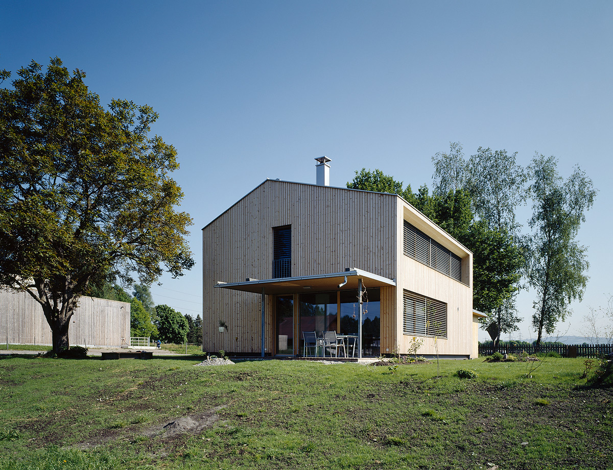 Die Dienstwohnung des Stallbetreibers fiel ebenfalls den Flammen zum Opfer. Als Ersatz wurde 2007 ein kleines, bescheidenes Einfamilienhaus in unmittelbare Nähe zum Stallgebäude errichtet. Der kompakte, nicht unterkellerte Holzbau wird von Norden erschlossen und besitzt an der komplett geschlossenen Ostseite einen Carport mit kleinem Schopf. Die optimierte Grundrissdisposition ist auf die Bedürfnisse einer kleinen Familie zugeschnitten. Gewohnt wird im Erdgeschoss rund um einen zentralen Ofen in der Wohnküche, die sich mittels Fensterband nach Süden und gedeckter Terrasse nach Westen öffnet. Im Obergeschoss befinden sich die kleinen Individualräume, deren Höhe an die Dachschräge angepasst ist, wodurch die Zimmer trotz geringer Fläche großzügig wirken. Das asymmetrische Satteldach geht auf die Grundrissanordnung ein und schließt mit der Fassade bündig ab. Die optimierte Gebäudehülle ermöglicht einen niedrigen Heizenergieverbrauch. Tief sitzende Fenster zeigen die starken, hoch wärmegedämmten Wände des in Passivbauweise ausgeführten Gebäudes.