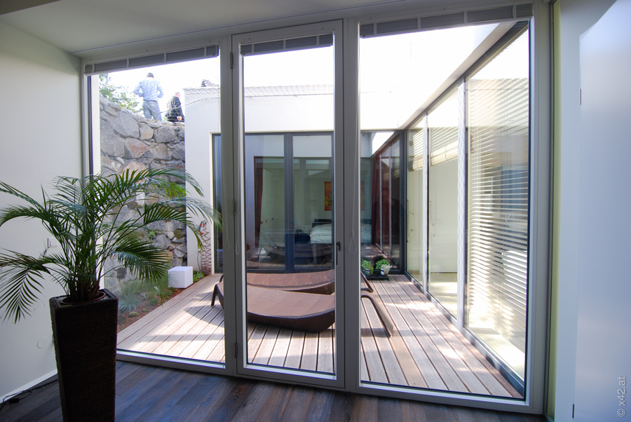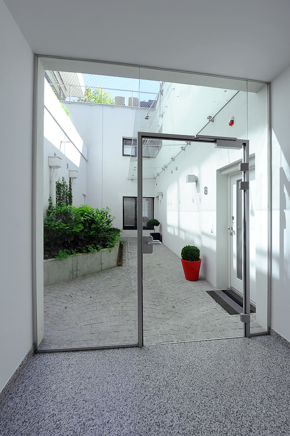 Über eine großzügige Eingangshalle erfolgt die Erschließung aller Wohneinheiten. Obwohl diese tief in den Hang reicht und weit unter dem Gelände liegt, verfügt sie über eine natürliche Belichtung. Vom Eingangsbereich, bzw. der Garage aus, ist mittels Lift jede Wohneinheit barrierefrei erreichbar.