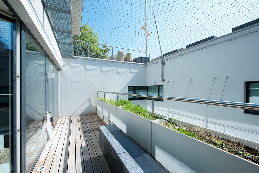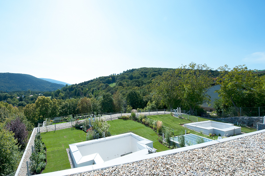 Die terrassierte Anordnung der Einheiten erzeugt großzügige Grünterrassen jeweils auf den Flachdächern der davor liegenden Wohnungen, die man aufgrund ihrer Größe durchaus als Eigengärten bezeichnen kann. Die Vorräume, Schlafräume, Bäder und Nebenräume befinden sich in den Untergeschossen der Wohnungen und werden über Atrien belichtet. Große Kellerabteile sind den Wohneinheiten hangseitig vorgelagert und werden über die offenen Zugangshöfe erschlossen.