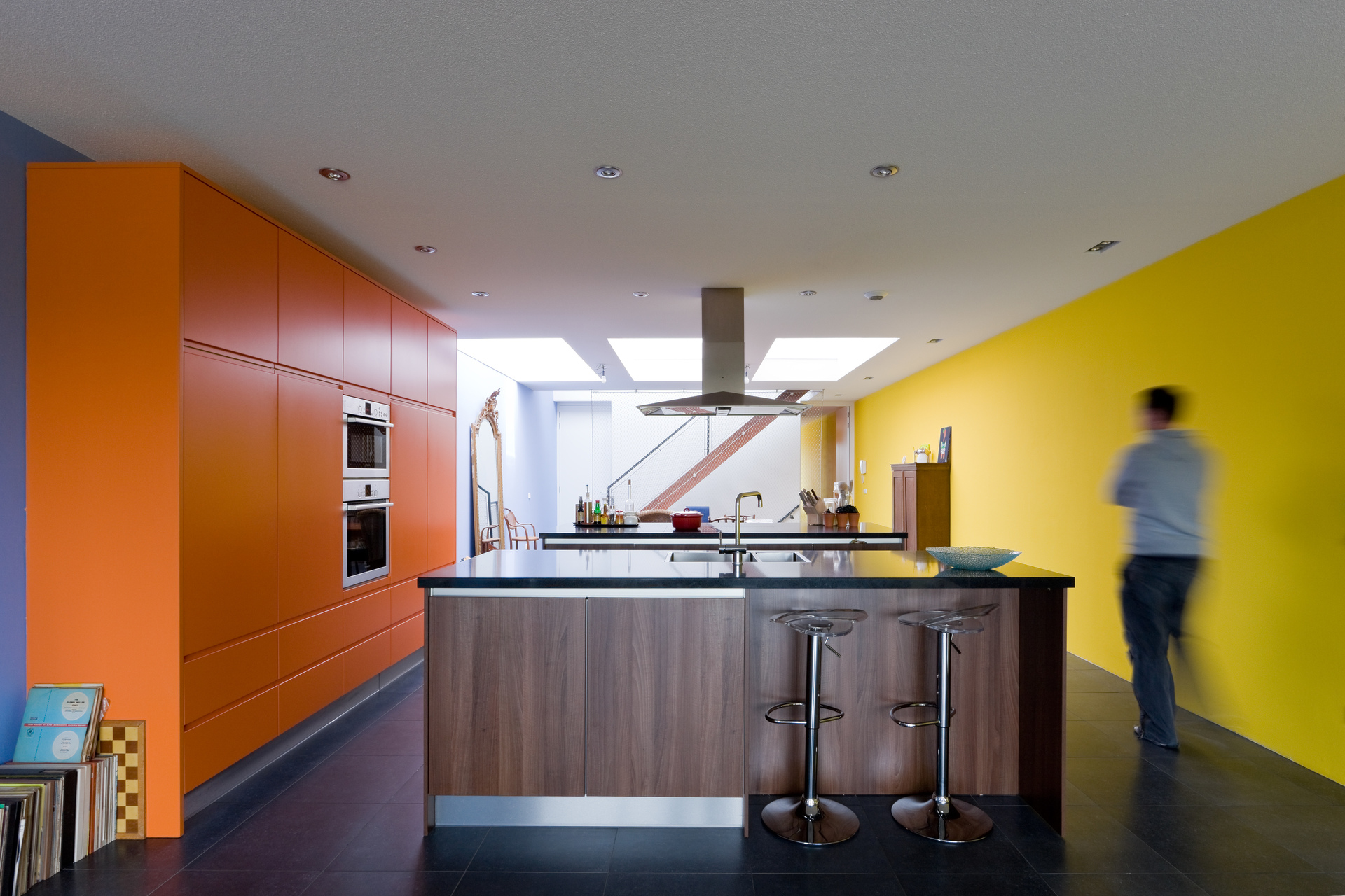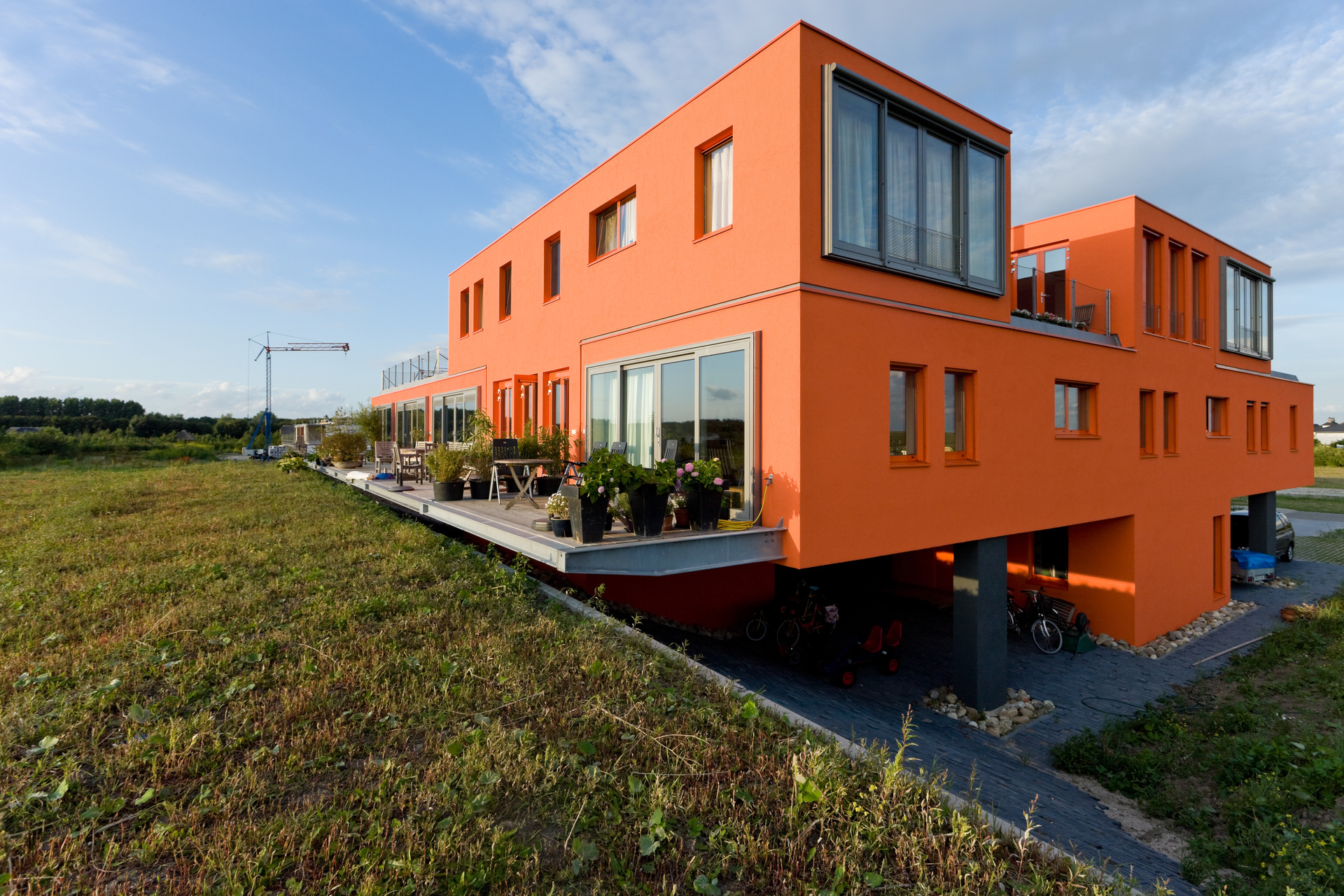 Ein großzügiges Raumprogramm mit einer Wohnfläche von insgesamt 5000 m², die Anmutung einer ländlichen Villa, abgestimmt auf die individuellen Bedürfnisse der Bauherren - mit diesen Vorgaben und unter Bezugnahme auf die Qualitäten der umliegenden Deichlandschaft variierten NEXT ARCHITECTS solange die Bauvolumina bis sie im Rahmen zahlreicher Workshops mit den späteren Bewohnern 5 sehr unterschiedliche Wohneiheiten mit höchste individuellem Charakter entwickeln konnten. Die Geschoße sind zueinader jeweils um ein Viertel gedreht, jede Wohneinheit verfügt über eigene Orientierung und Raumabfolge über zwei Geschoße. So ist die Aussicht über die ländliche Idylle des Deichs am Gooimeer garantiert. (Text: Helga Kusolitsch)