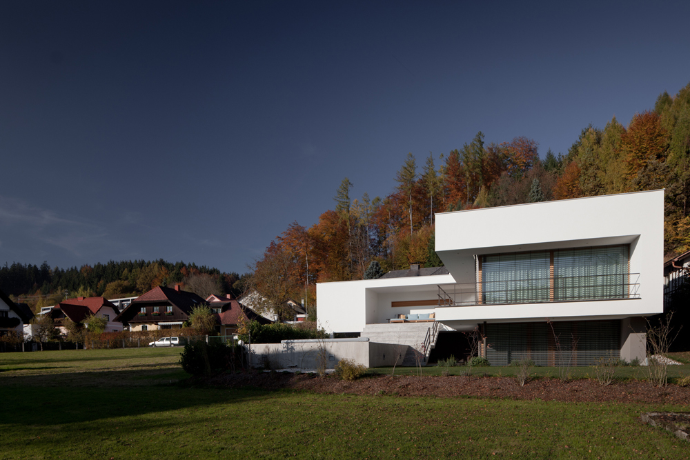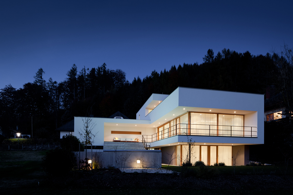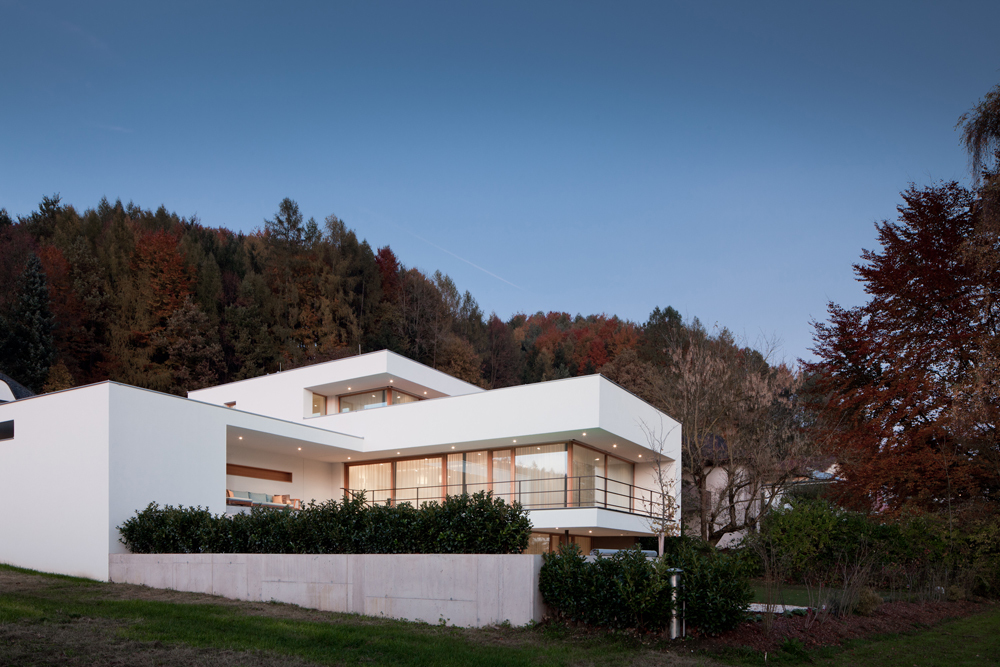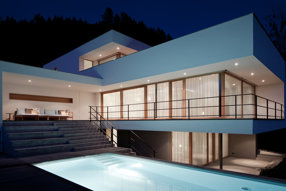 Das Schwimmbad bildet eine Ebene zwischen Erd- und Untergeschoss bzw. Garten.