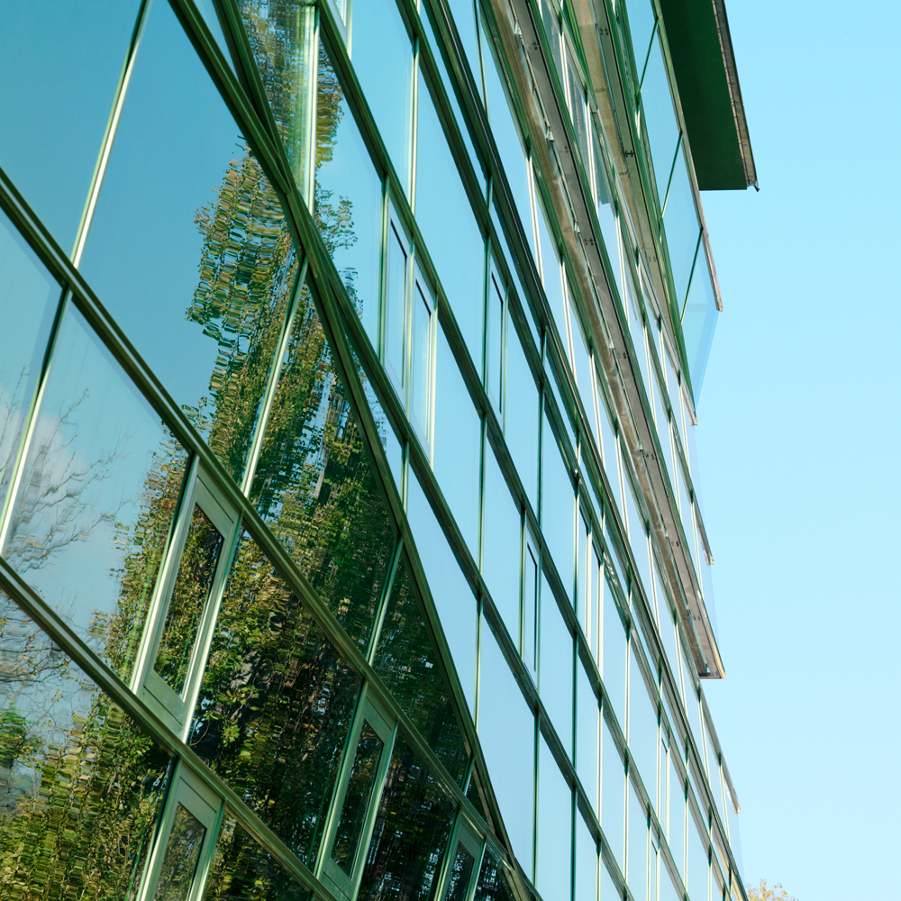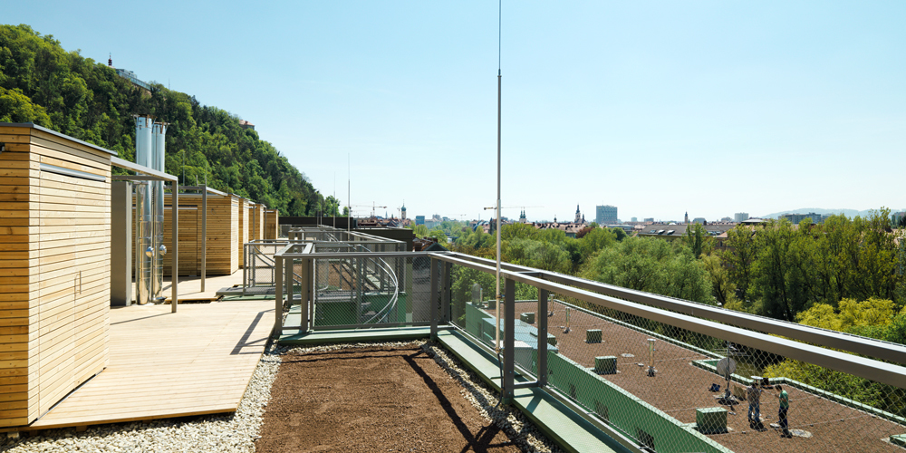 Das Vorderhaus orientiert sich zur baumbestandenen Körösistraße hin und bietet im Erdgeschoß großzügige Flächen für Geschäftsräume, im 1. und 2. Obergeschoß für Büroräume. Das Hinterhaus liegt am dicht bewachsenen Mur-Kai und ist allein dem Wohnen vorbehalten, wobei dem Erdgeschoß kleine Privatgärten zugeordnet sind. Um hier die Belichtungssituation - auch für die Tiefgarage - zu verbessern, ist dieser Baukörper etwas angehoben und hat weniger Geschoße als das Vorderhaus, so dass von den obersten straßenseitigen Wohnungen auch noch ein Blick über das Hinterhaus hinweg Richtung Mur möglich ist. Am Dach sind 2-geschoßige Penthouses untergebracht, deren Blick ins Grazer Hügelland, über die Stadt hinweg bis in die westlichen Randberge reicht. (Text: Irmgard Brottrager)