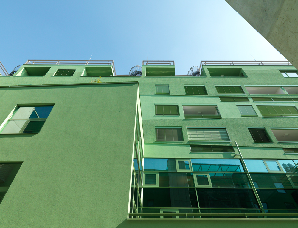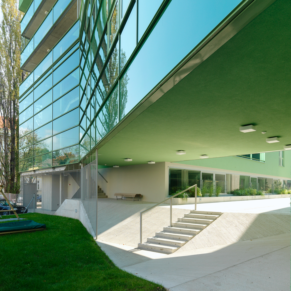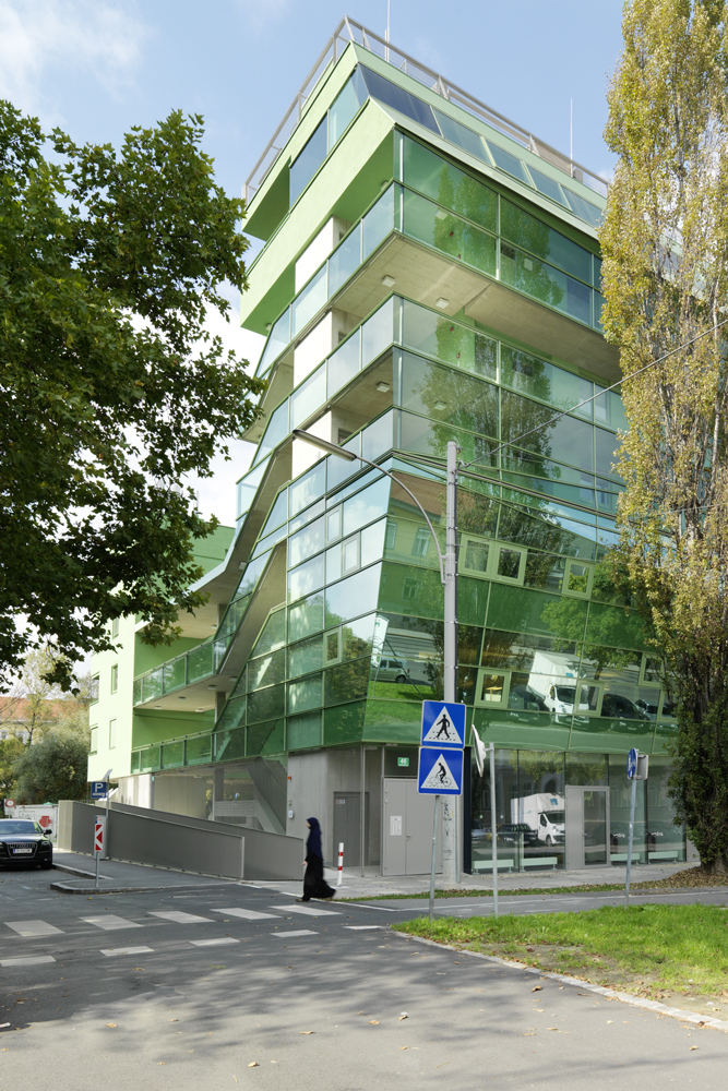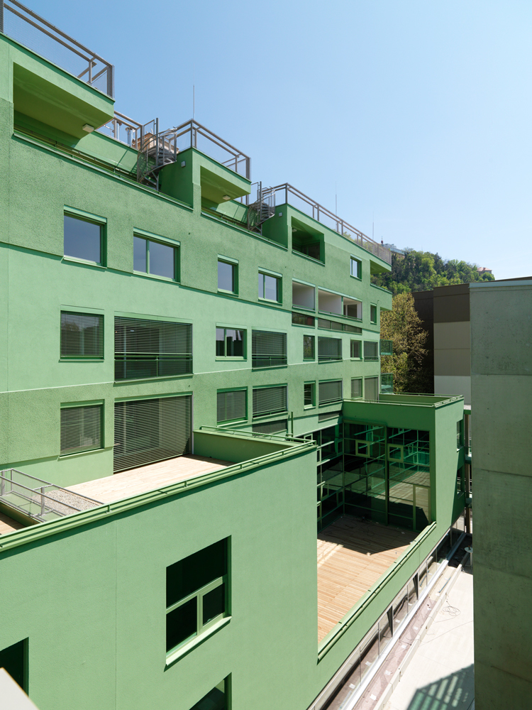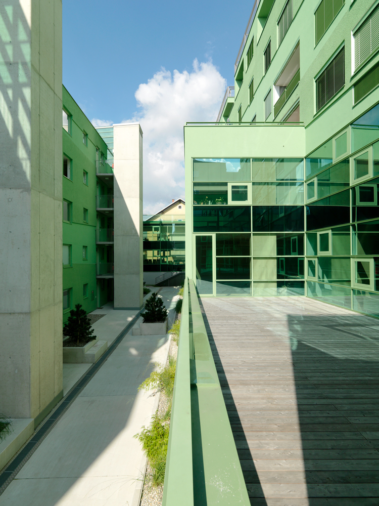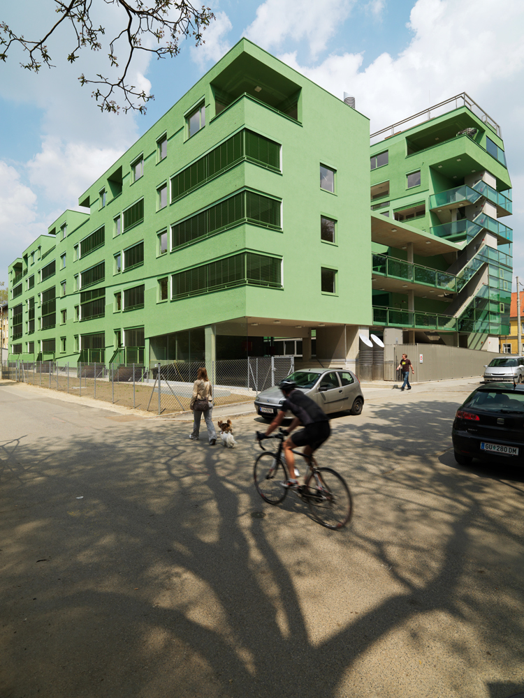 Der über 6.500 m² Nutzfläche umfassende Baukörper besteht aus einem Vorderhaus und einem Hinterhaus, dazwischen erstreckt sich ein länglicher Innenhof, der die darunterliegende Tiefgarage überdeckt. An den seitlichen Fassaden sind die Erschließungsgänge herumgezogen, sodass sich auch hier ein relativ geschlossenes Erscheinungsbild ergibt. Die Fassaden und auch der Innenhof sind mit Vor- und Rücksprüngen, schrägen Linien und geknickten Kanten sehr lebendig gestaltet. Südseitig befindet sich die Tiefgaragenzufahrt und eine Rampenanlage zum höher gelegenen Wohnhof hinauf. Auf der Nordseite faltet sich die Hofebene wieder hinunter auf das Straßenniveau und bildet zugleich den Übergang zum Kinderspielplatz.