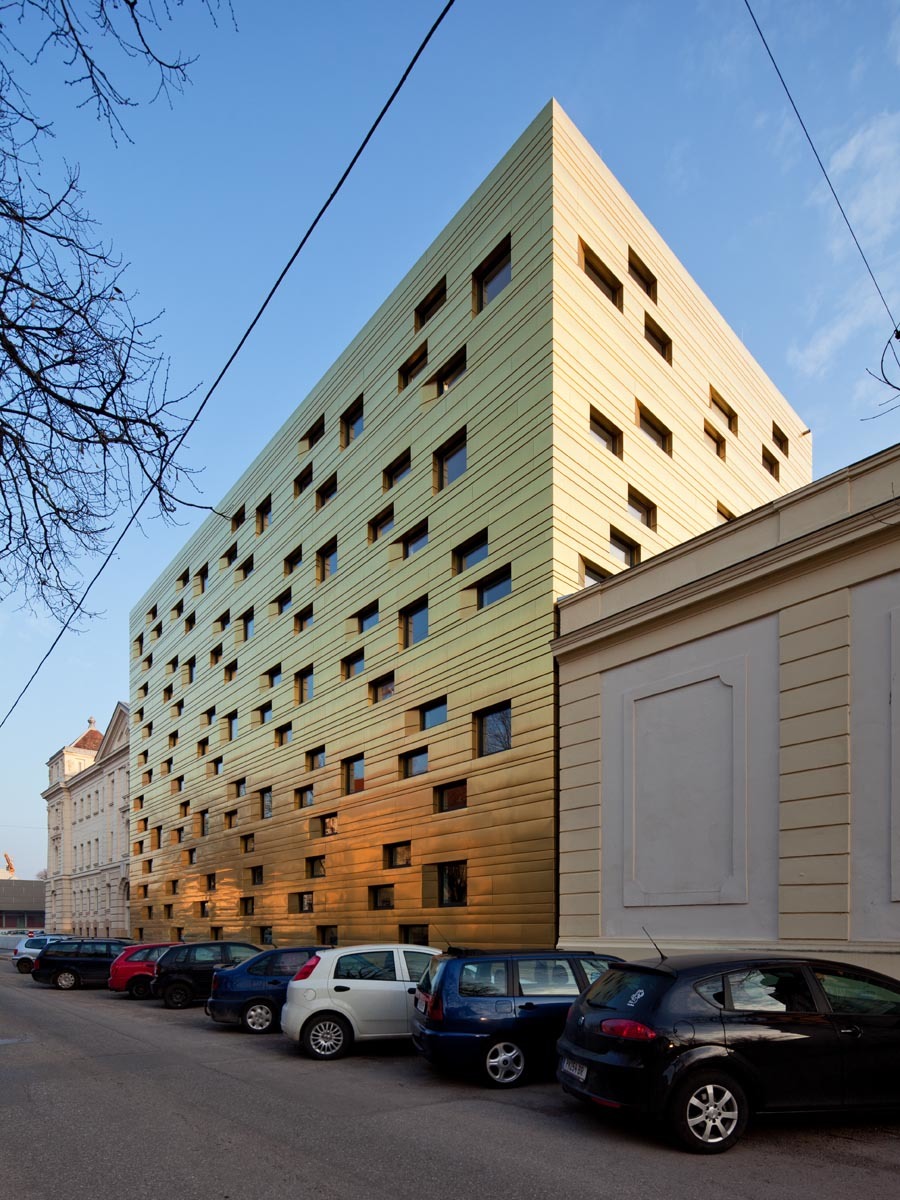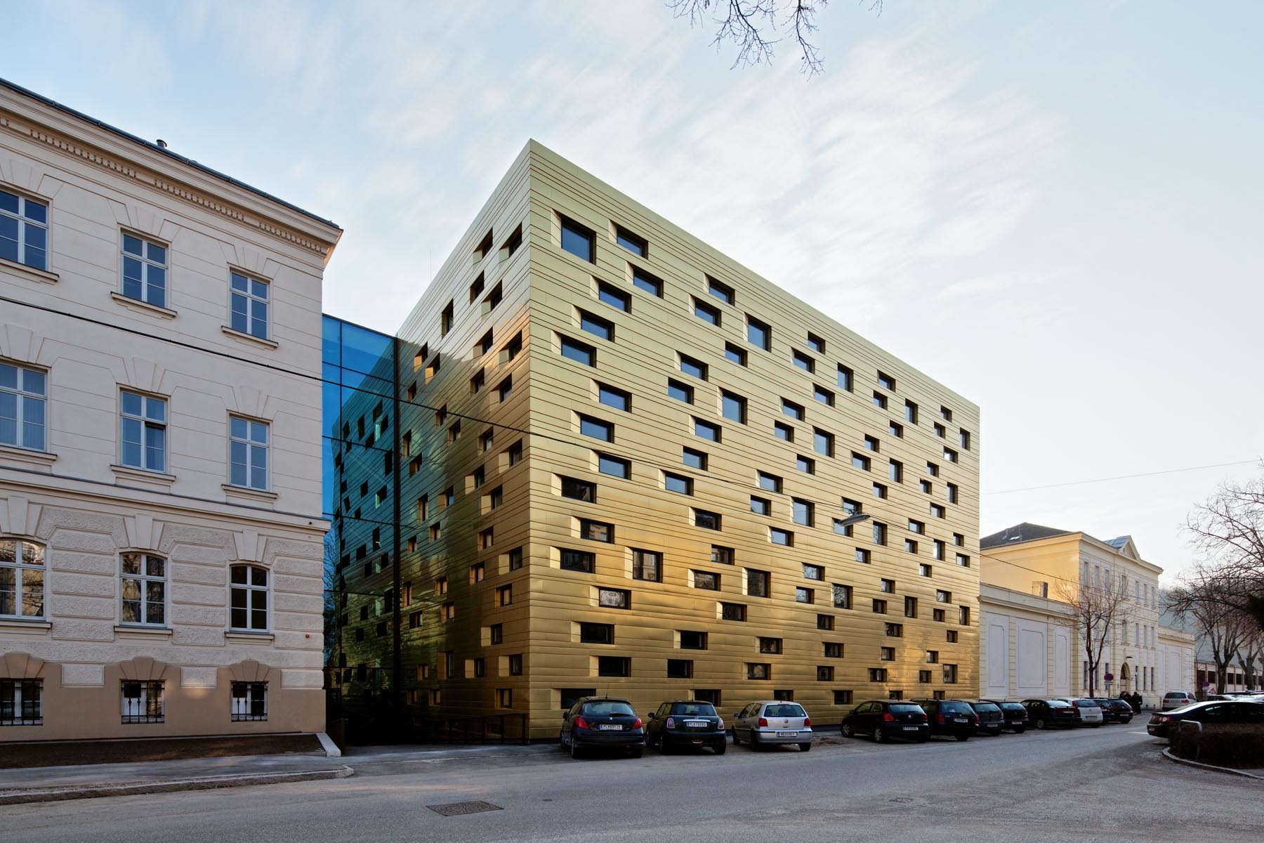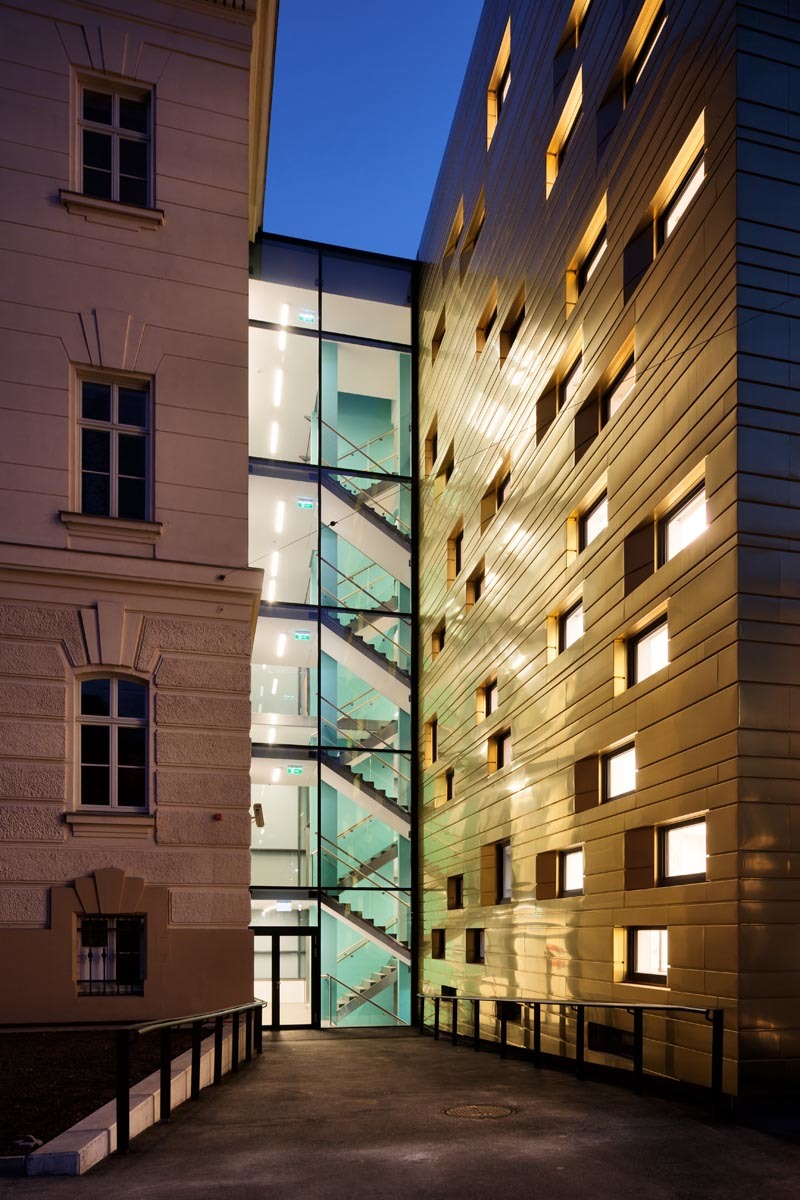 Städtebaulich schließt der neue Zubau die Lücke zwischen altem Gerichtsgebäude und der angrenzenden Justizanstalt in Form einer kohärenten Ergänzung des denkmalgeschützten Baus mit einem zeitgenössischen Zubau, der einerseits selbstbewusst und eigenständig als Solitär nach außen wahrnehmbar ist, zugleich jedoch den historischen Kontext respektiert und zwischen moderner und historischer Formensprache zu vermitteln vermag. Die drei Geschosse des Altbaus werden bei gleichbleibender Traufenhöhe barrierefrei mit dem neuen fünfgeschossigen Baukörper verknüpft, in dem in erster Linie Büroräume für das Oberlandesgericht, die Staatsanwaltschaft und das Bezirksgericht untergebracht werden.