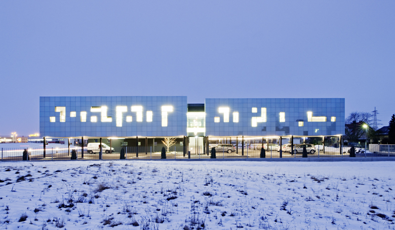 Das Gebäude sollte ein Unternehmen für Facility Services und Gebäudereinigung repräsentieren. Es wurde deshalb für die vorgehängte Fassade das Material „Glas“ gewählt, das dem Konzept des „Reinigens“ am ehesten entspricht, und den Pflegeaufwand gering hält.