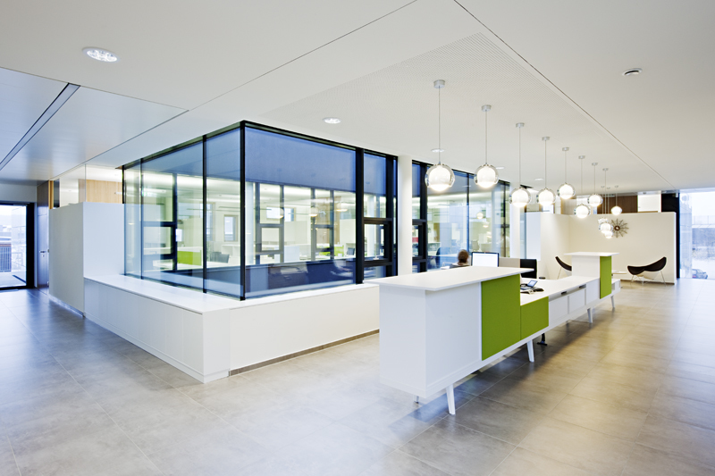 Das Gebäude soll Visitenkarte eines großen Unternehmens für Facility Services sein und die Unternehmenskultur eines Familienunternehmens mit einer flachen Hierarchie räumlich umsetzen.
