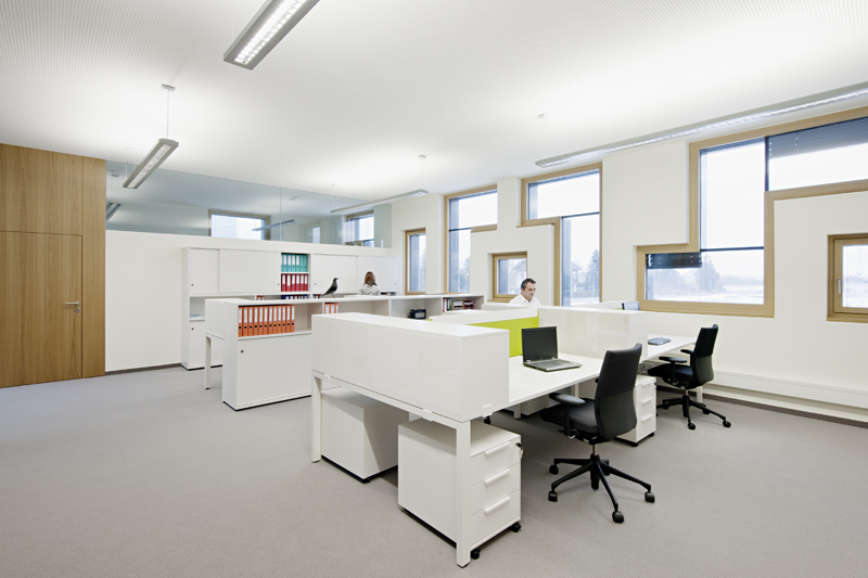 Die Büroflächen von ca. 1200 m² sind der Unternehmenskultur entsprechend auf nur einer Ebene im Obergeschoss organisiert. Die damit entstehende hierarchielose räumliche Organisationsstruktur zwischen offenen und geschlossen Büros sowie einer freien Zwischenzone soll die Kommunikation der Mitarbeiter fördern und für optimale Abläufe sorgen. Zwei innenliegende Höfe schaffen zusätzlich ein Klima des Wohlbefindens und der Konzentration.