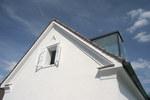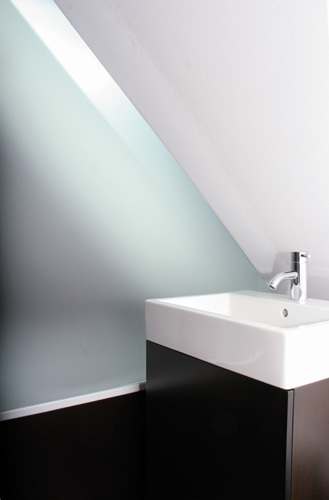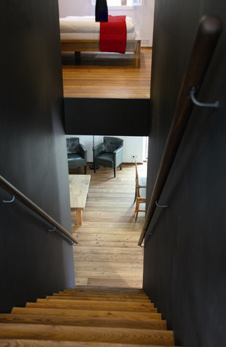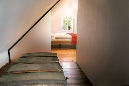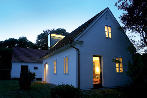 „Mehr Licht“ ist auch Thema im neuen Obergeschoss. Neu, weil der ungenutzte Dachboden zum Leben erweckt wurde. Von der Stiegenwand bis zur Begrenzung des Schlafzimmers reicht eine Sichtachse über die gesamte Tiefe der Etage – das lässt die lediglich 9,5 x 5,5 Meter kleine Fläche größer erscheinen als sie ist. Noch augenfälliger aktiviert den Bezug zwischen Innen und Außen die neue Lichtgaube fürs Badezimmer, das zwischen Sanitärbereich und Schlafzimmer eingefügt ist. Hier hinterlassen wir Architekten unser Signet zugunsten der Bewohner. Der große Lichtsammler lässt Badende in die Weite blicken, sammelt Sonnenstrahlen, ersetzt den archetypischen Kamin und bringt auch den Außenstehenden die Erkenntnis: Architektur leistet mehr als das Trockenlegen alter Mauern. (Text: Architekt)