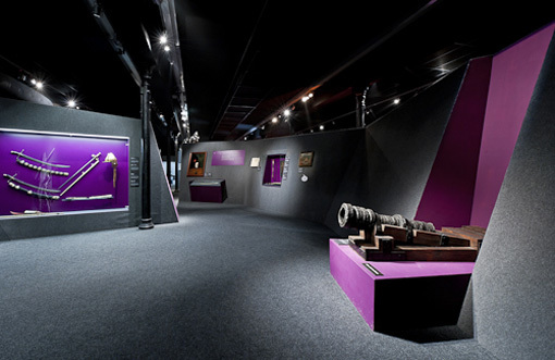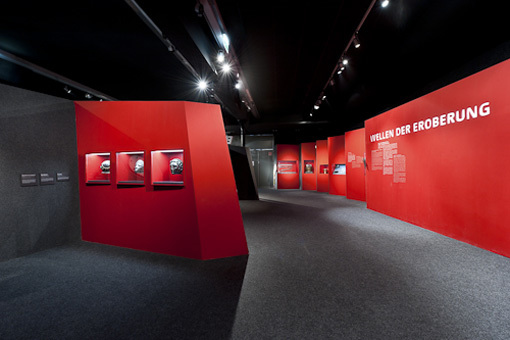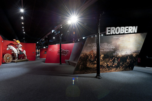 Im oberen Geschoss liegen die Themenbereiche geografisch und zeitlich weit auseinander. Völker und Heere durchwandern im Laufe von Jahrhunderten große Landstriche und bilden neue Kulturen aus. Der Raum ist durch Falten gegliedert, einzelne Spezialthemen, wie etwa der Bergbau, werden durch Raum-im-Raum-Situationen speziell eingefasst.