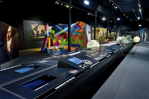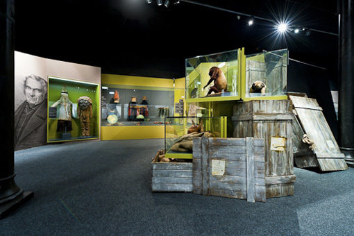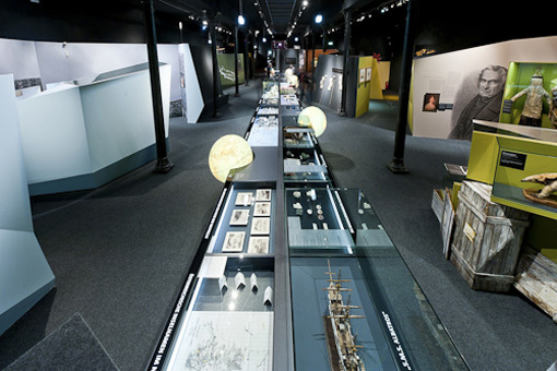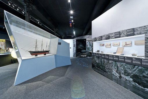 Im unteren Geschoss liegen die Themenbereiche inhaltlich und zeitlich näher beisammen; dazu gehören Forschungsreisen und Expeditionen, von denen Ausrüstungsgegenstände, Dokumente und Fundstücke wie Tierpräparate, Steine und Pflanzen erhalten sind. Gemäß der unterschiedlichen Arbeitsweisen der Forscher und Wissenschaftler wird die individuelle Charakteristik berücksichtigt, die Ausstellungslandschaft ist hier kleinteiliger und besteht aus den Elementen „Insel“, „Ausblick“ und „Forschertisch“.