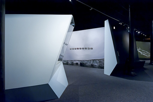 Die daraus entstandene Idee einer „Ausstellungslandschaft“ bespielt die bestehenden Räume mit weitläufigen Höhenzügen und Tälern, kleinteiligen Strukturen, Konturen und Erhebungen. Raumbereiche fließen ineinander, Durchblicke und Raumgrößen bleiben aufgrund der niedrigen Einbauhöhen erhalten. In beiden Geschoßen folgt das Landschaftskonzept dem Prinzip der Überraschung und dem Spiel mit dem Verborgenen und Unbekannten.