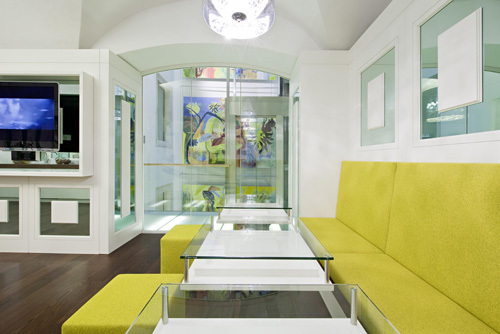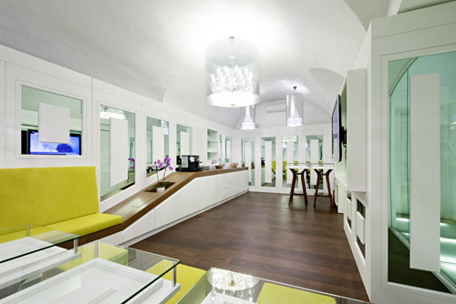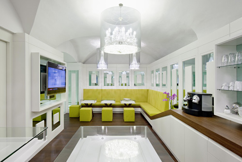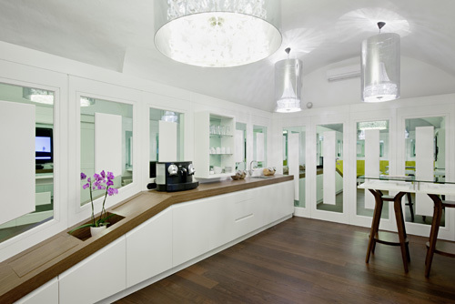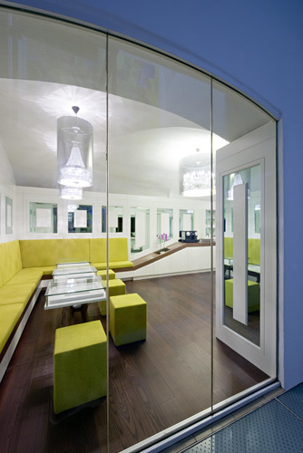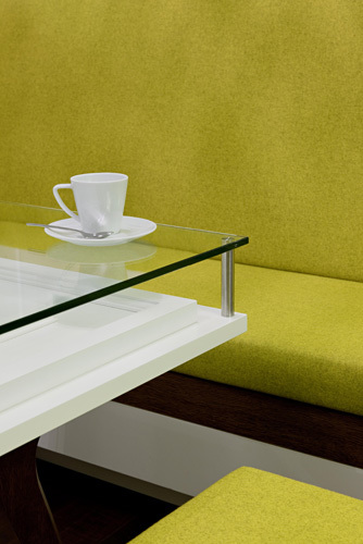 Die Basis für die Möblierung bildet ein typisches Element aus dem Wiener Kaffeehaus - die Sitzbank. Als grundlegenden Ansatz für die Gestaltung wählten die Architekten eine moderne Auslegung des klassischen Elements der Vertäfelung. Die Tische wurden aus den Profilen der Wandvertäfelung interpretiert. Weißes Holz und Verspiegelungen geben dem relativ kleinen Raum mehr Großzügigkeit, wobei für die Spiegelflächen die Farbe grün gewählt wurde, um das Corporate Design der BCG einfließen zu lassen. Eine in den Korpus integrierte Zeitschriftenablage unterstreicht den Pausencharakter der Mitarbeiterlounge, zahlreiche unsichtbare Stauflächen hinter der Vertäfelung wahren den respräsentativen, aufgeräumten Eindruck. (Text Architekten, redaktionell überarbeitet Martina Frühwirth)