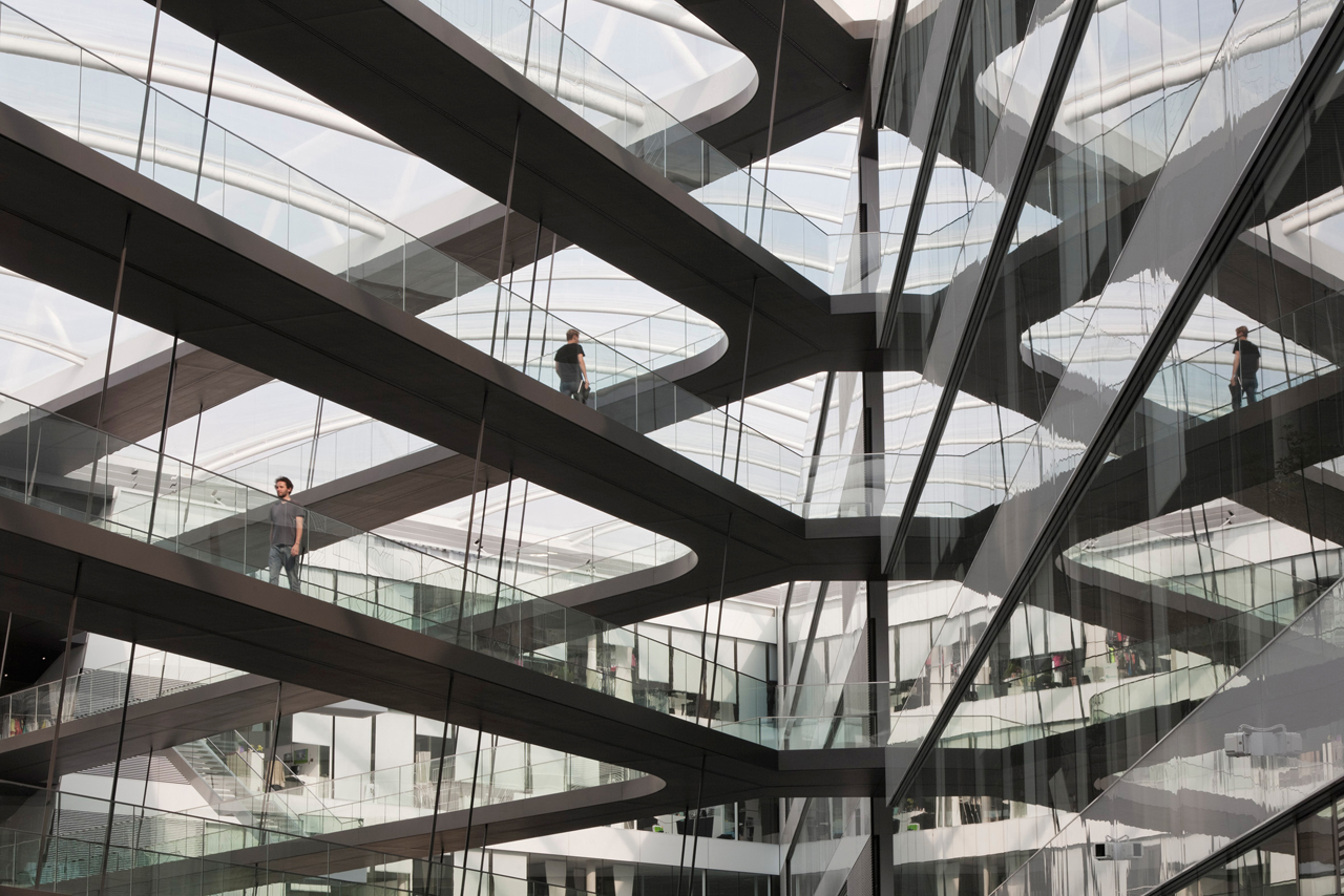 Im Unterschied zu konventionellen Bürotypologien ermöglicht die von kadawittfeldarchitektur entwickelte Ringstruktur des Gebäudes einen zweifachen Landschaftsbezug – sowohl zur äußeren Umgebung als auch zur kommunikativen Landschaft des Atriums. Die Laces als Verbindungsstege erlauben eine effiziente Erschließung aller Bürobereiche ohne Queren fremder Abteilungen. Gleichzeitig verwandeln sie das Atrium in das identitätsstiftende, kreative Zentrum des Gebäudes.Das neue Laces fügt sich als schwebendes Pendant zu dem schwarzen, liegenden Baukörper des adidas Brand Centers in das bestehende Ensemble der „World of Sports“ ein. Das klar konturierte Volumen lädt den umliegenden Campus förmlich ein, sich im Innern als temperiertes Atrium fortzusetzen. Ringschlüssig aufgereiht öffnen sich die Büroflächen mit großzügigen Verglasungen zum atmosphärischen Innenraum und zu dem bemerkenswerten Landschaftsraum. Die das Atrium überspannenden Verbindungsstege, die Laces, „schnüren“ den Baukörper gleichsam zu einem vielschichtig beziehungsreichen Bürogebäude zusammen. Sie ermöglichen ein Höchstmaß an Interaktion und lassen offene Kommunikationsbereiche entstehen. Als filigrane Verbindungsbrücken verweben sie den Innenraum zu einem poetischen Raumgefüge und machen damit die besondere kreative Atmosphäre des Hauses ablesbar. Es entsteht ein inspirierender Ort für die Forschung und Produktentwicklung. (Text: Architekt:innen)