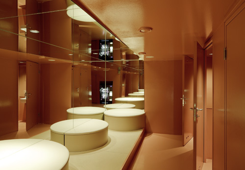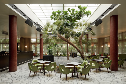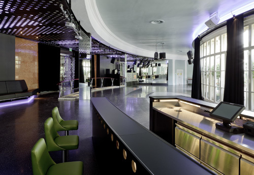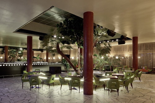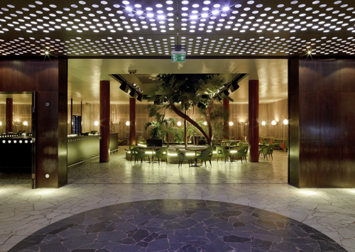 So entsteht ein neues Ganzes, das die vorhandenen Qualitäten des Altbestandes wiederbelebt und mit zeitgemäßen Mitteln auffrischt. Besonders markante Teile der ursprünglichen Haerdtl Planung wie der „Wintergarten“ sind gut erhalten und werden sorgsam in Hinblick auf die Raumwirkung restauriert. Die cortische Säulenhalle mit den Raumergänzungen von Haerdtl wird „entrümpelt“ und in ihrer kraftvollen Kurvung spürbar gemacht. Die Diskothek, wo keine originalen Raumteile mehr vorhanden sind, wird zur Gänze eingekleidet. (Text: Architekten)