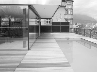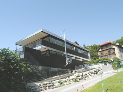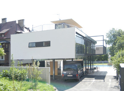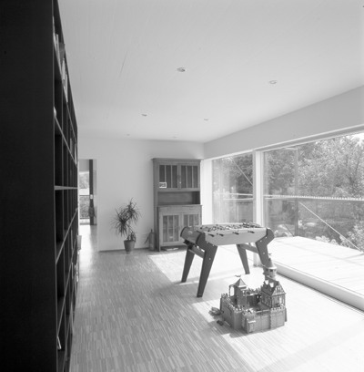 Das Erdgeschoss bildet als Domäne des allgemeinen Familienlebens eine nutzungsoffene und blickdurchlässige Basis. In den stützenden Treppenhauskern sind Nebraumflächen wie WC, Stauraum und Küchenblock integriert, durch die Versetzung der Ebenen rückt dieser in die Mitte der Obergeschossfläche, die in feiner Symmetrie vier Schlafzimmern Raum gibt und einen grosszügigen „Zwischenraum“ mit angedocktem Balkon definiert. Der Treppenaufgang zur grossen Dachterrasse schließlich bekrönt die Struktur mit einer luftigen Kanzel. (Text: Gabriele Kaiser, 09.10.2003)