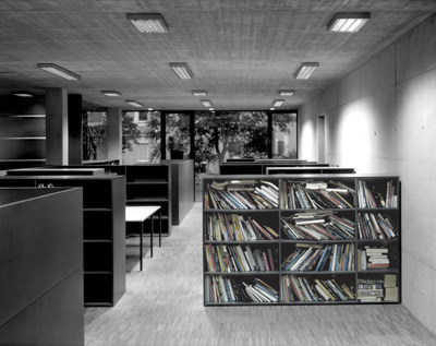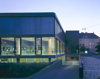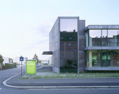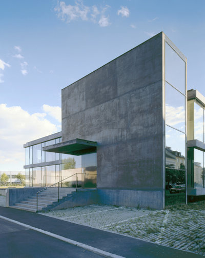 Vom Parkdeck ein wenig in die Höhe gelüpft gewinnt das annähernd quadratische Gebäude mit dieser Geste gleichzeitig Leichtigkeit und Imposanz. Die strenge Geometrie des Baukörpers bei weitgehender Auflösung der Außenwände und die auf Sichtbeton und Glas reduzierte Materialität setzen das Zwiegespräch zwischen Masse und Transparenz konsequent fort. Insbesondere der massive Erschließungsturm an der Ecke mit dem über eine Freitreppe erschlossenen, von einem Vordach beschirmten Eingang lässt weder in seiner Funktion noch als Zeichen Zweifel zu. Zur Gänze aus Sichtbeton errichtet, ist er folgerichtig thermisch vom Gebäude entkoppelt, dem er tatsächlich nur zur Erschließung dient.