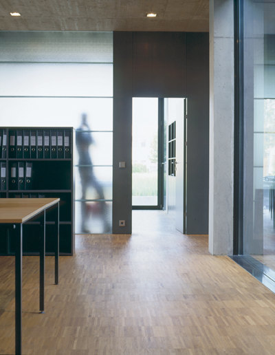 Das Haus selbst ist ungeachtet seiner großzügigen Fensterflächen auf sich bezogen konzipiert. Die Glaswände bedeuten Licht, nicht Panorama. Der um ein kleines Atrium organisierte Grundriss des Hauses bietet eine Mischung aus Einzel- und Großraumbüros, die mit eigens entworfenem Mobiliar sowohl auf die Ungestörtheit des Individuums Rücksicht nehmen, als auch den Austausch in der Gruppe fördern. Hier spielt wieder die Geradlinigkeit der auf wenige Materialien wie geöltes Holz, Sichtbeton und Glas reduzierten Oberflächen eine kultivierende Rolle. Das Haus hat mit einer kleinen Holzterrasse auf seiner Rückseite der Steppe sogar noch einen brauchbaren Grünraum abgerungen. Ein Anfang ist gemacht. Nicht zum Schaden für die Stadt.