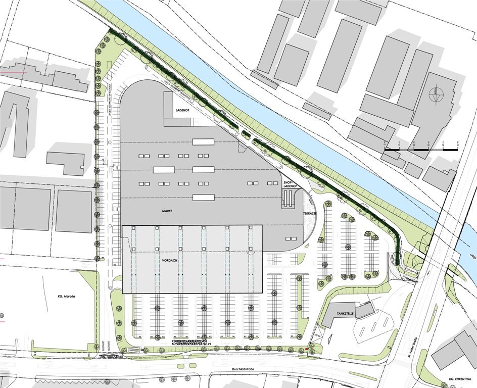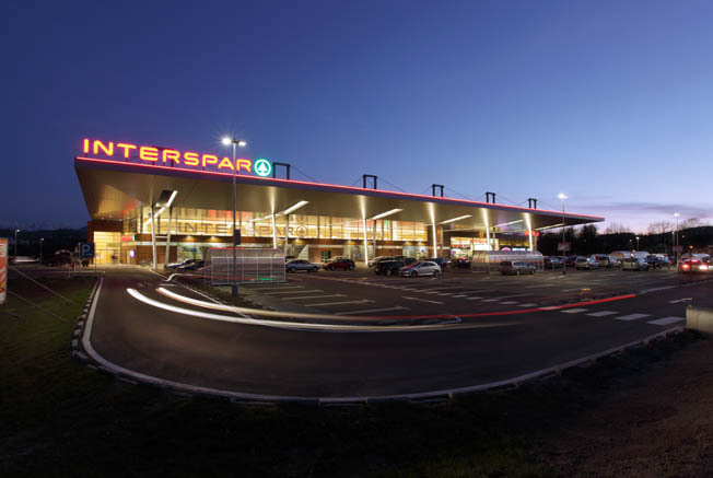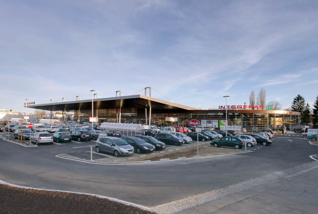 Die Eingangsfassade ist von einem 33,0 m x 96,0 m großen Vordach überspannt, unter dem ca. 80 PKW Platz finden. Die gesamte Vordachkonstruktion ist von sechs Pylonen abgehängt und besteht aus einer Trägerrostkonstruktion, die über die gesamte Länge durchläuft. Entlang der Pylonachsen bringen Lichtbänder Tageslicht bis zur Fassade und in das Innere des Gebäudes. Das Dach wurde in Einzelteilen bis 40t angeliefert, am Boden mit den Pylonoberteilen verspannt und Achse für Achse in die endgültige Höhe gebracht. Sowohl das komplexe statische System, als auch der Transport und die Art der Montage waren eine logistische Herausforderung. Die Untersicht des Vordaches wurde mit einer Metallfassade verkleidet. Der gesamte Hohlkörper des Vordachs ist querdurchlüftet. Nach 18 Monaten Bauzeit ist der INTERSPARMARKT an der Durchlaßstrasse im März 2011 seiner Bestimmung übergeben worden. (Text: Architekten)